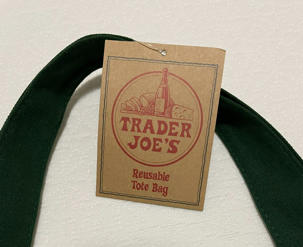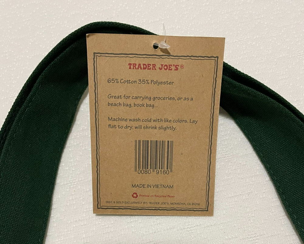 Country of Origin:VietnamSize:LargePattern:SolidItem Width:6 inBrand:Trader Joe'sItem Height:14 inMPN:00773836, 00809160Number in Pack:1Material:CanvasType:ToteItem Length:20 inStyle:TraditionalCare Instructions:Machine wash cold with like colors. Lay flat to dry; will shrinkOriginal/Reproduction:OriginalColor:GreenFeatures:Foldable, Side PocketsPersonalize:NoModel:Reusable Tote Bag