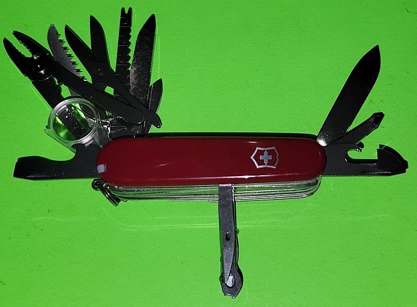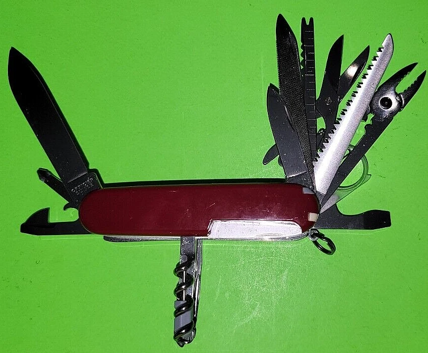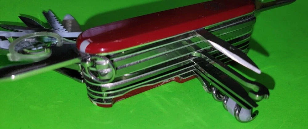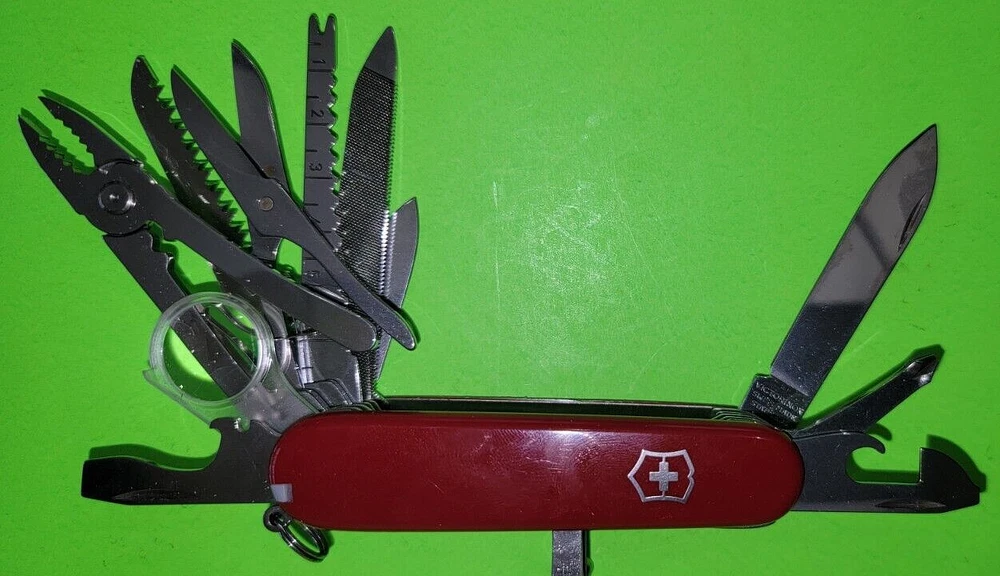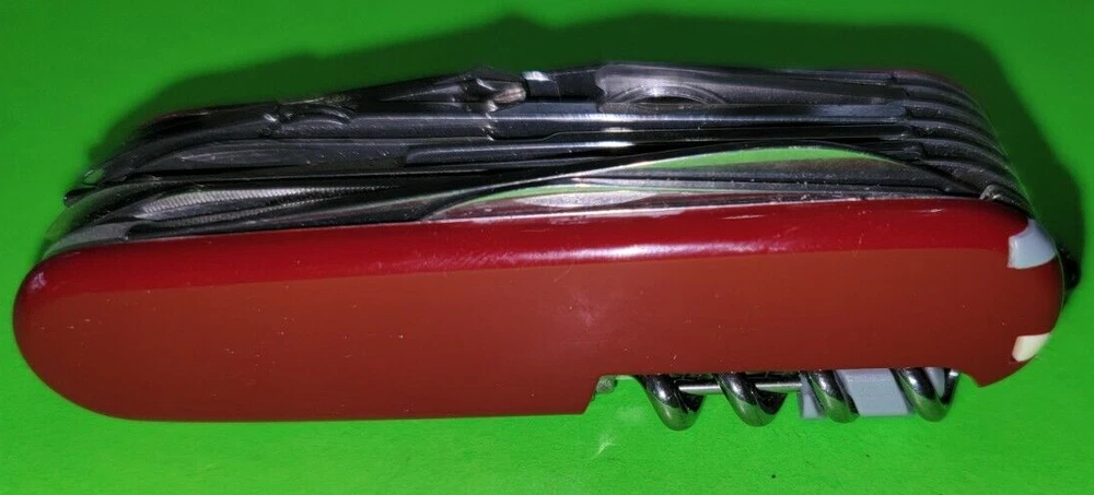 This is a newest version SwissChamp that is new but pulled from a display hence we have no box. Knife has never been used or handled and is perfect it has no defects, no wear, and nothing missing. We do not have the box. Buyer pays 7.00 shipping.