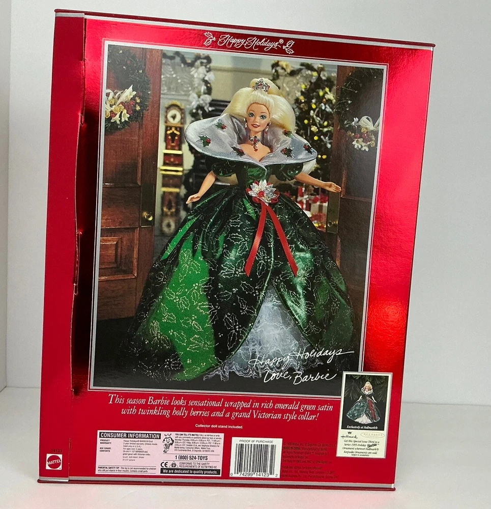 Step back in time with this vintage 1995 Happy Holidays Christmas Special Edition Barbie Doll, a must-have for collectors and enthusiasts alike. Dressed in her iconic green gown, this 11.5-inch fashion doll radiates classic elegance and is a testament to Barbie's timeless appeal. The doll features curly white hair, green eyes, and a light complexion, capturing the essence of the beloved character. With item number 14123, this Barbie comes from a proud lineage of the Holiday Barbie product line, offering a touch of nostalgia and fashion beauty. She's designed for display and enjoyment by adult collectors, but can also be a delightful addition for those aged 10 and up. Complete with original packaging that has been opened, she's a special piece that celebrates both the holiday spirit and the enduring legacy of Barbie.