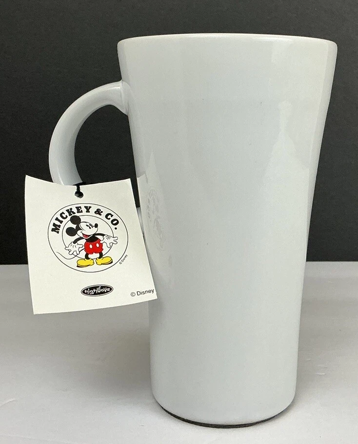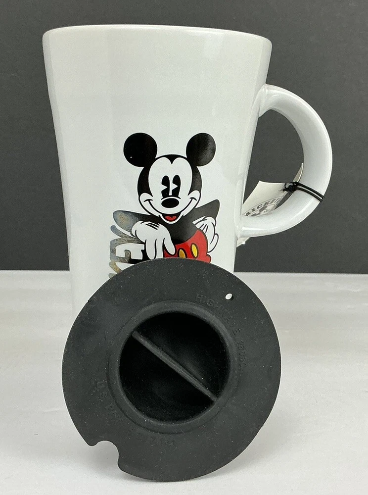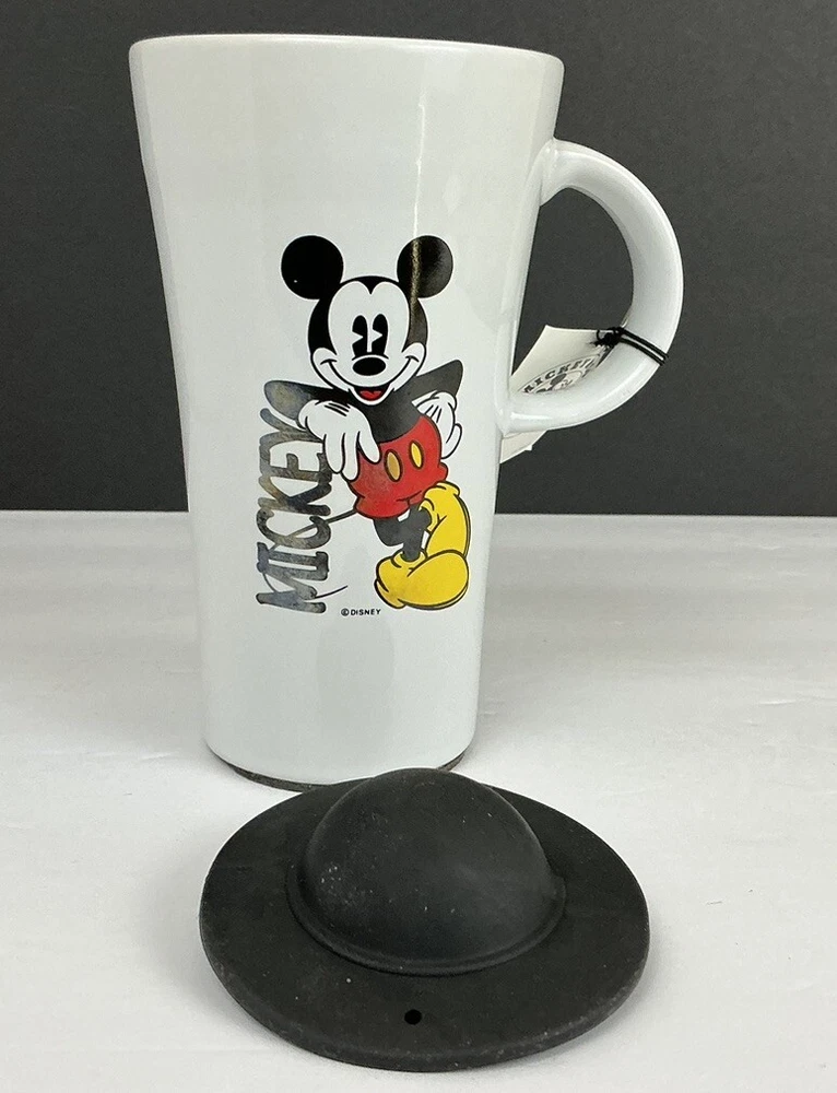 This Disney MICKEY MOUSE Tall Ceramic Travel Tumbler/Mug Coffee Cup 12oz is the perfect addition to any Disney fan's collection. The cup features Mickey Mouse, one of the most iconic characters in the Disney franchise. It is made in Thailand and is a contemporary piece, perfect for collectors looking for something new and unique. The cup is designed for travel, making it a great way to take your favorite beverage on the go. The top has a rubber lid to prevent spillage as well as a non slip bottom. The High Wave brand ensures that this cup is made with high-quality ceramic materials, making it durable and long-lasting. Mug stands 6” tall and has a diameter of 3.5” at the top.