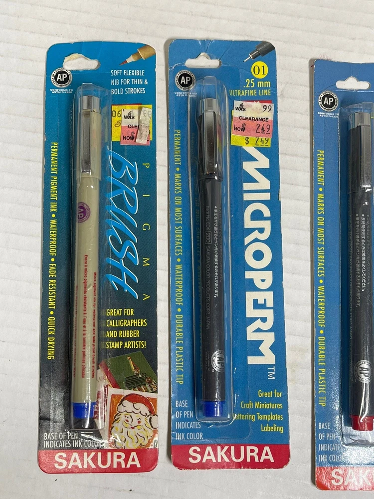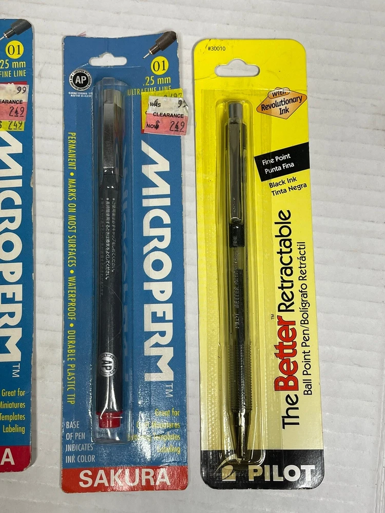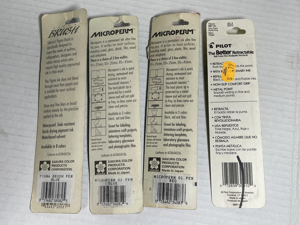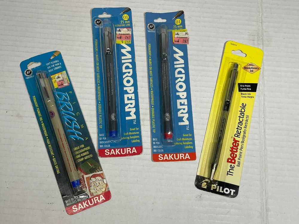 NEW Vintage Lot Of 4 Pens Sakura Pigma Brush Microperm Pilot Better Retractable See pictures for the exact pens you will receive. Ink colors: black, red and 2x blue. Cannot guarantee the pens still write, these are vintage and still sealed. Sold as is.