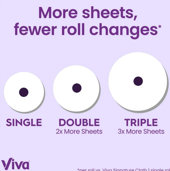 Give yourself a paper towel that works as hard as you do with Viva Signature Cloth Paper Towels. This pack of Viva paper towels includes 6 triple rolls with 129 sheets per roll and features Viva’s Choose-A-Sheet size that lets you choose the right sheet size for your task. As the softest and most durable towel*, our paper towels deliver an exceptional, thorough clean. They’re also the most cloth-like towels, making them great for hands and faces! Not only are they soft, but these paper towels are also strong like cloth and are 2x more durable**, making them perfect for scrubbing tough, dried-on messes. Plus, you can rinse and reuse each sheet for multiple cleaning needs. (*among premium branded towels. Durable when wet) (**when wet vs. the leading 1-ply value brand) WHAT’S INCLUDED — 6 triple rolls of Viva Signature Cloth Paper Towels, 129 sheets per roll (6 triple rolls = 18 regular rolls) PREMIUM QUALITY — Signature Cloth is the softest and most durable* paper towels for an exceptional, thorough clean (*among premium branded towels. Durable when wet) PROFESSIONAL GRADE — These paper towels are 2x more durable** and soft like cloth so you can clean like a pro (**when wet vs. the leading 1-ply value brand) RINSE, REUSE, REPEAT — These aren’t just any paper towels. Signature Cloth is the most cloth-like towel; rinse and reuse each paper towel until the job is done ONE TOWEL, ANY JOB — Our paper towels are strong, soft and clean like cloth to power through any cleaning job CHOOSE A SHEET — Viva Choose-A-Sheet allows you to choose the right sheet size for any task, big or small Packaging may vary