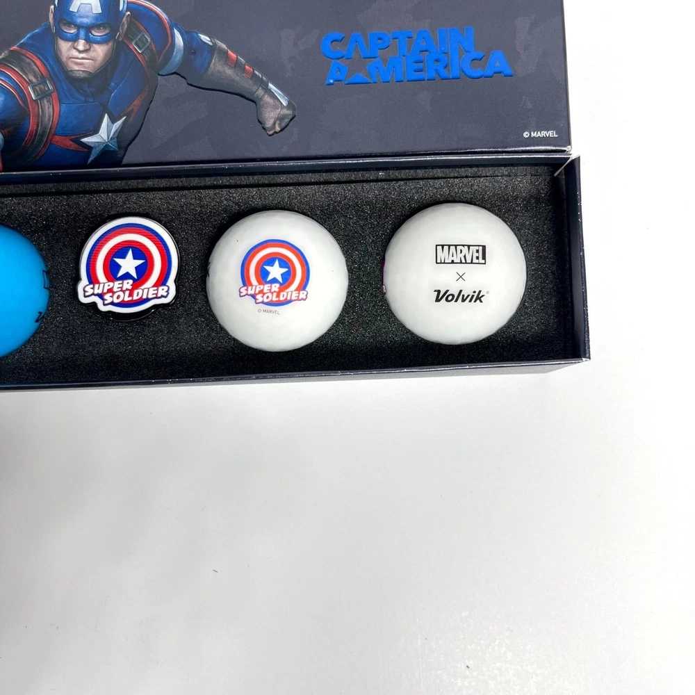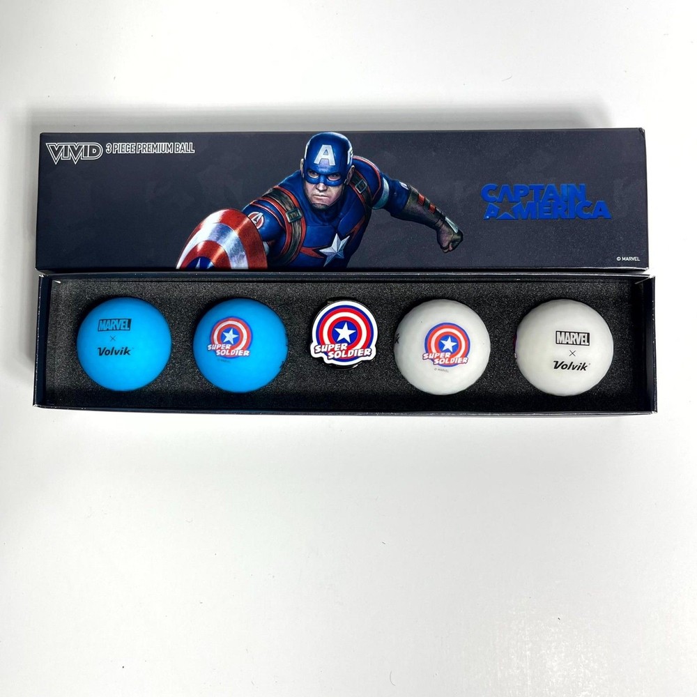 NEW Volvic Golf Ball Marker Marvel Gift Pack 2.0 (Captain America), 4 Balls and Marker Set Limited edition Volvik and Marvel collaboration golf balls with a marker set. The popular Captain America pressure ball is a great gift! Great for yourself, or as a prize for golf competitions or as a gift for someone you love. Golf balls are the world's first matte colour ball Volvik VIVID that stops and looks good.