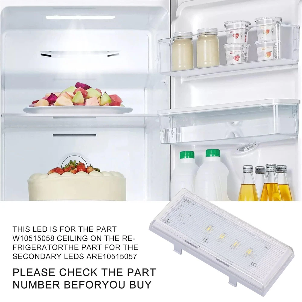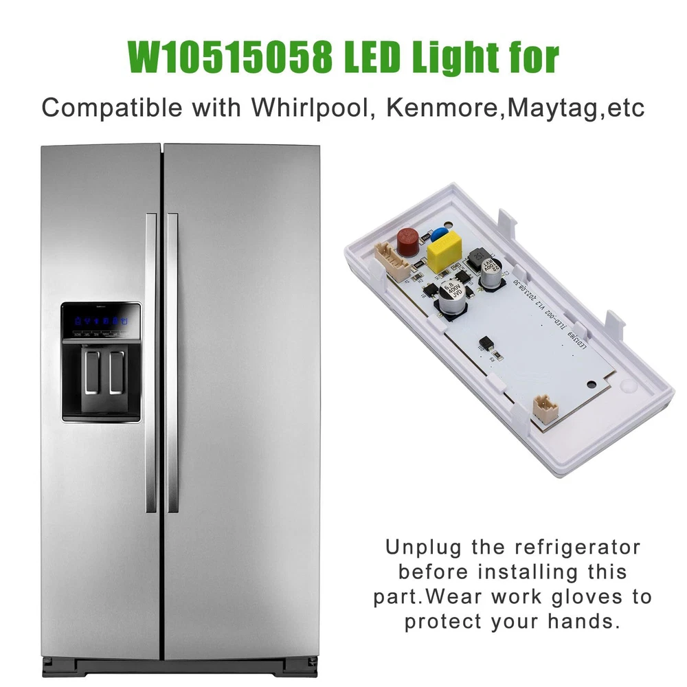 This part compatible with Whirlpool,Kenmore,Maytag,Ikea,Kitchenaid. Replacing Part Number: 8MSF25N4BW00,MSF21D4MDH01,MSF21D4MDH00,WRS325FDAB06,WRS325FDAB05,MSF25D4MDH02,WRS325FDAB04,10651729410,WRS342FIAW02,10641129211,10641129212,10651129212,10651129211,10641129210,10651129210,8MSF25N4BW02,WRS342FIAW00,WRS331FDDM01,WRS335FDDB00,WRS331FDDM00,10641129213,WRS335FDDB02,WRS335FDDB01,MSB27C2XAM00,WRS325FNAH00,10651135610,WRS325FNAH01,MSF25D4XAW00,WRS342FIAB00,MSF22D4XAW00,WRS342FIAB02,MSF22D4XAW0 Fits the following models (not all applicable models may be listed): 10651122211, 10651123211 , 10651124211 ,10651129211 , 10651129212 ,10651799412 , 10641122210 ,10641122211 , 7WRS22FDBF00 , 7WRS22FDBF02 , 7WRS22FDBW00 , 7WRS22FDBW02 Refrigerator. Part Number:WPW10515058 replaces these: WPW10515058, W10465957, W10515058, W10522611, WPW10515058VP, PS11755867, AP6022534, 3021142 .(No plastic case, only PCD board) IMPORTANT; Before Purchasing this item, you must check the other two led lights in the refrigerator. One is located in the mid section of the cooler side, the other one is located in the freezer side. If any of these lid lights are bad they must be replaced before the new main board installed . if these led lights are bad it will cause the main board to burn shortly after installation This part works with the following brands: Whirlpool, Kenmore, Maytag, KitchenAid. ,this listing is for the main led light located in the ceiling of the cooler side If you buy this led and still the leds do not work, that means you have short circuit with other two leds. You need to buy 2 pieces of W10515057 and replace all three to have working leds. If you have any questions, please login to your Amazon buyer account to leave us a message, we will solve you as soon as possible