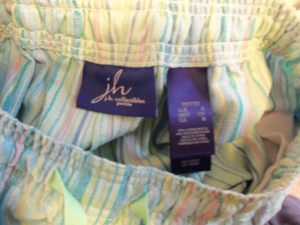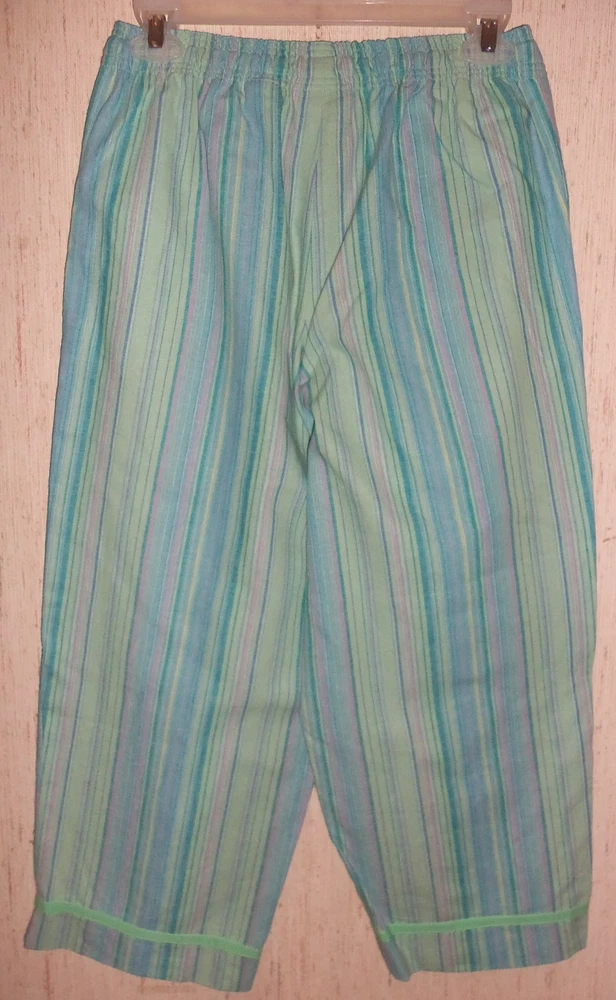 FOR YOUR CONSIDERATION IS WOMEN'S CAPRIS / CROPPED PANTS j.h.collectibles BRAND -- petite SIZE: PS -- ADJUSTABLE DRAWSTRING ELASTIC WAIST MEASURES 13" LAYING FLAT, INSEAM IS 23", RISE IS 10", SIDE SEAM POCKETS 55% LINEN, 45% RAYON -- MACHINE WASHABLE COLOR: AQUA WITH MULTI COLOR STRIPES BRAND NEW -- CUTE & COMFY! THANK YOU FOR LOOKING