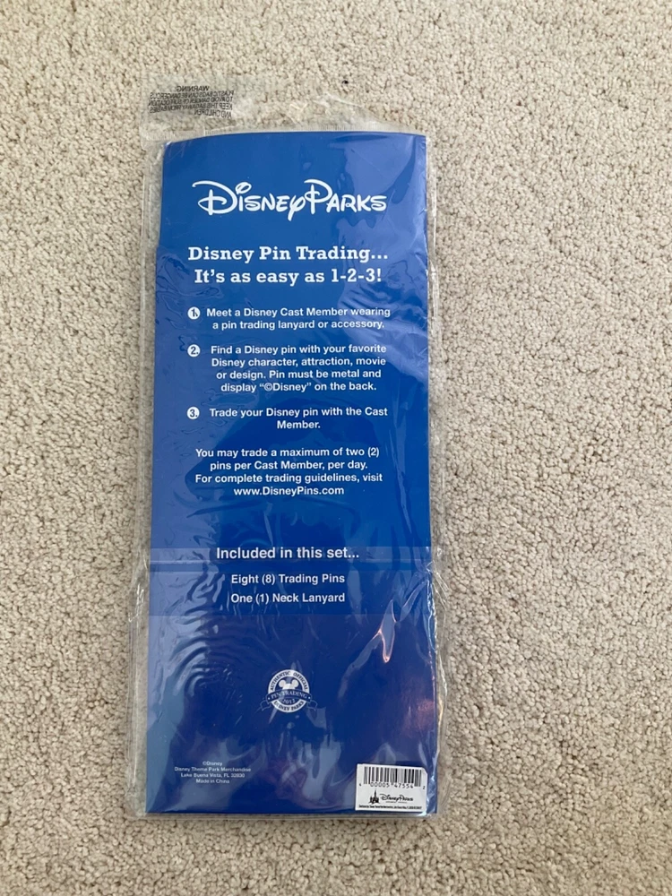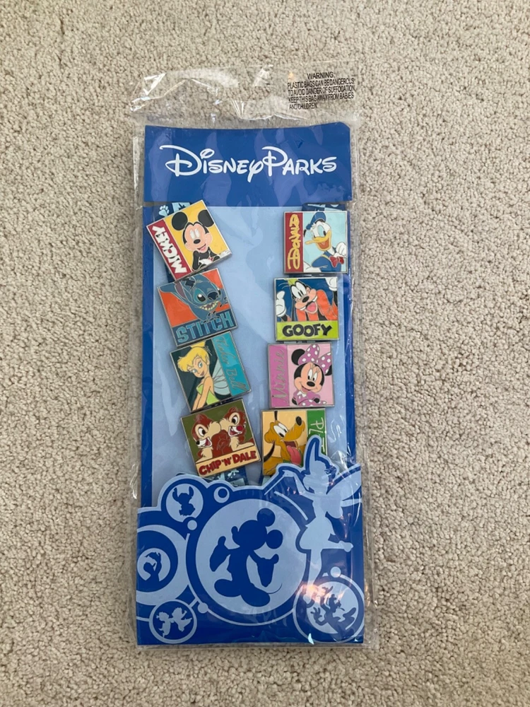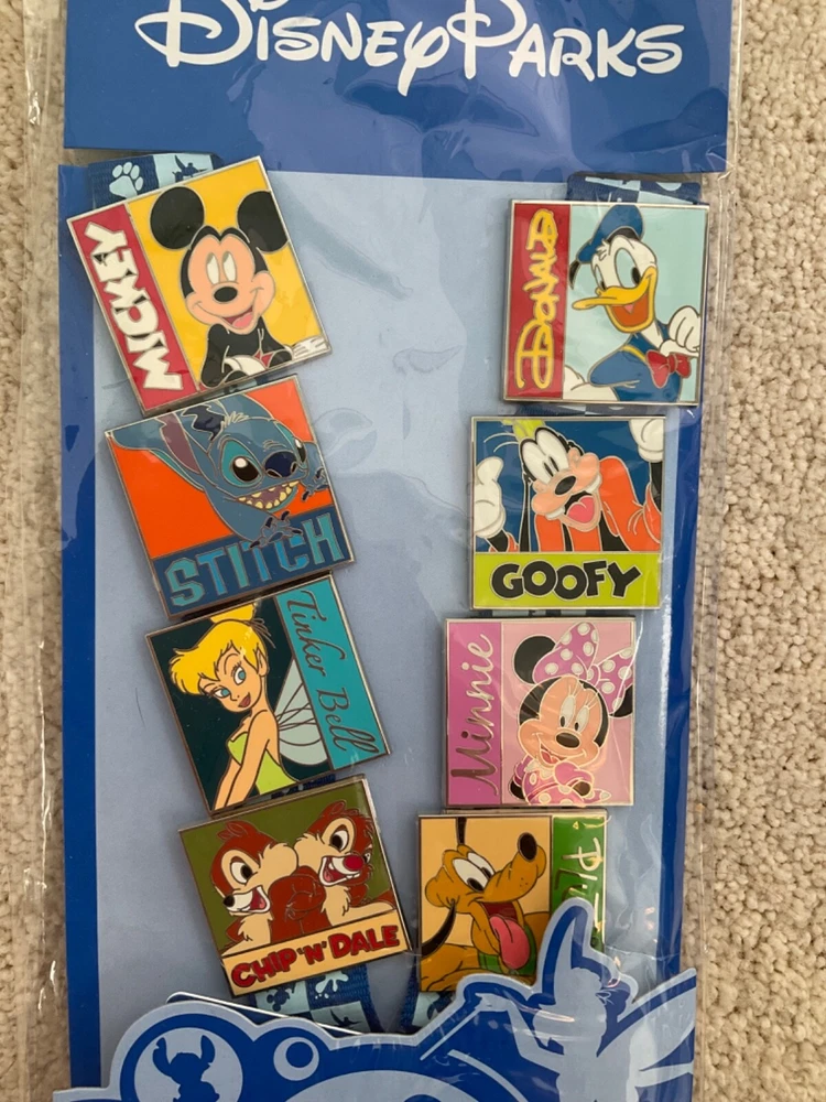 NEW in original packaging: Walt Disney World Parks Pin Trading Starter Set Includes: 8 pins (+ lanyard) featuring Mickey Mouse, Donald Duck, Stitch, Goofy, Tinkerbell, Minnie Mouse, Chip & Dale, Pluto. Note: There is a small tear in the cellophane package as shown in picture but this is a new unopened set.