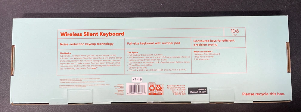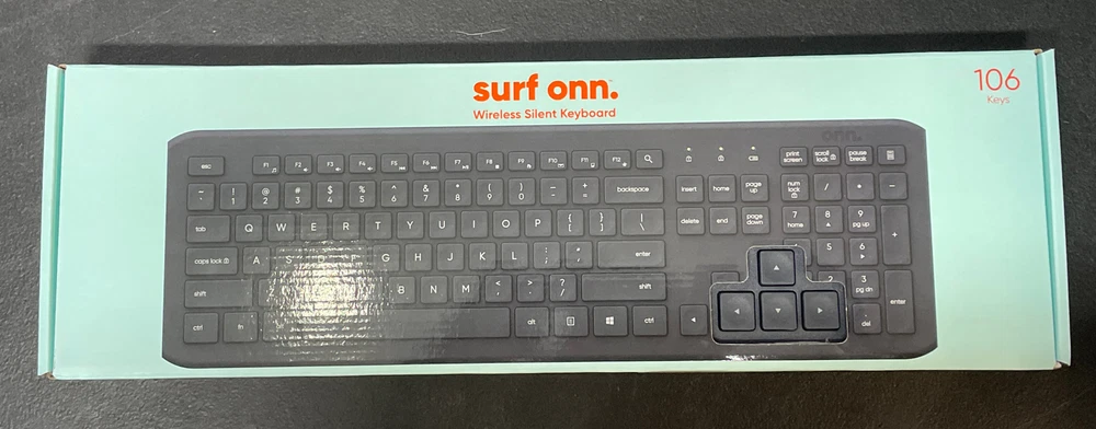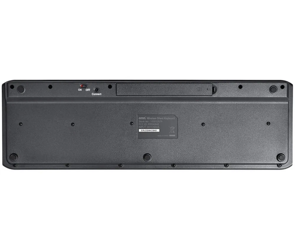 MPN: 100012579 gtin13: 0681131308977 Type: Standard Model: Onn. Wireless Silent Features: Built-In Battery, Plug & Play, Noise reduction keycap technology Brand: ONN Connectivity: Wireless Color: Black Keyboard Layout: QWERTY (Standard) UPC: 0681131308977