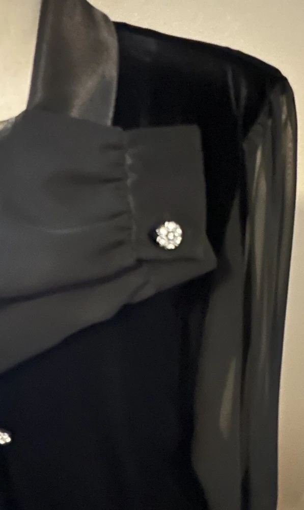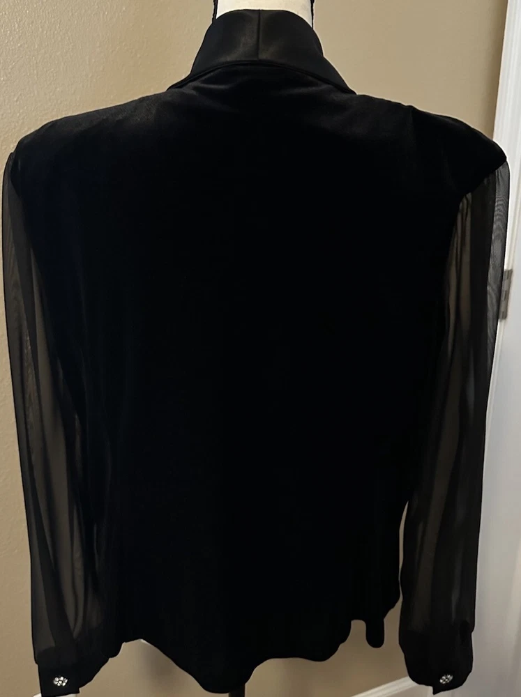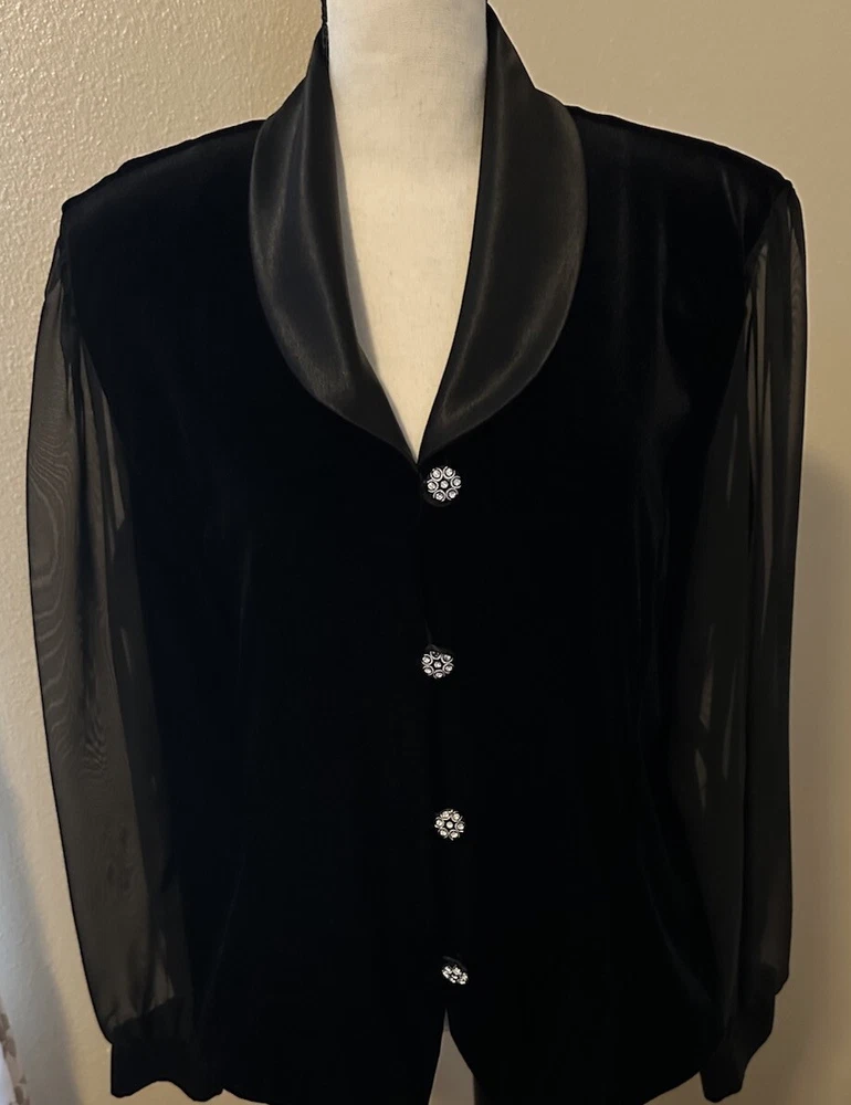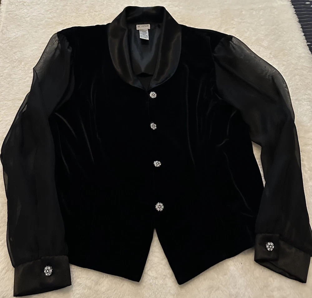 Metaphor NEW YEARS FORMAL Black Velvet Chiffon Sleeve Rhinestone Button TopJacket XL Worn On e and Dry Cleaned Approximate Measurements Bust 23 Length from shoulder 24