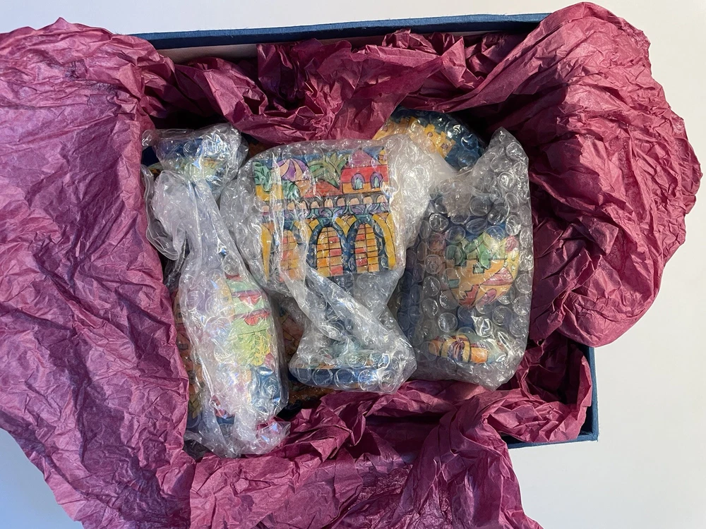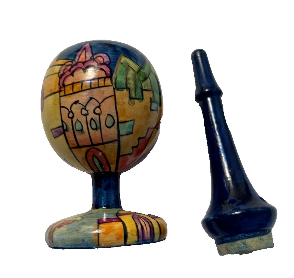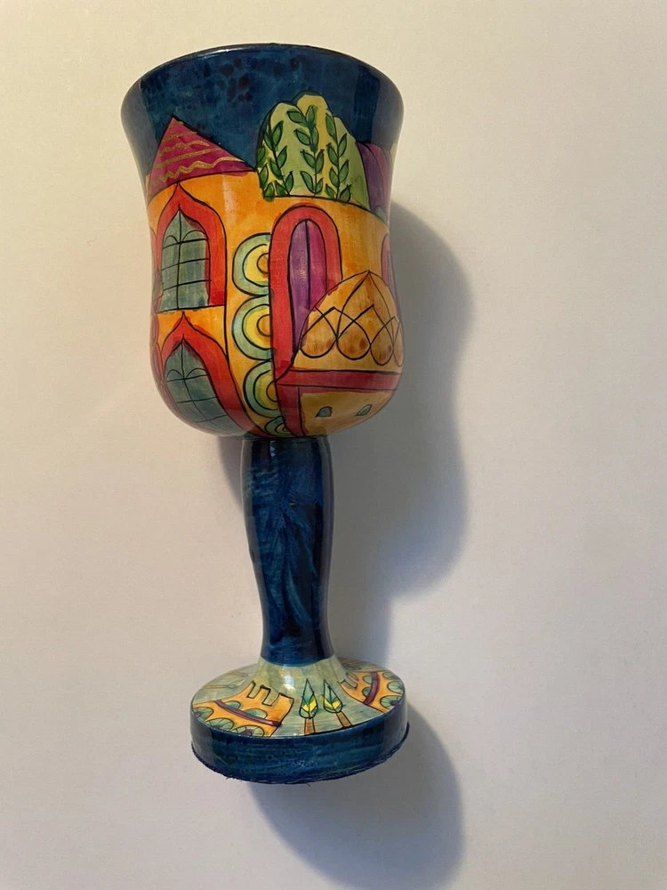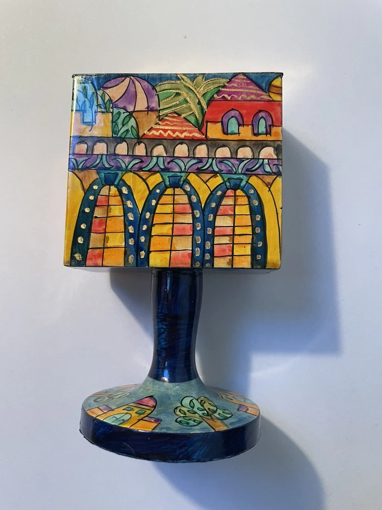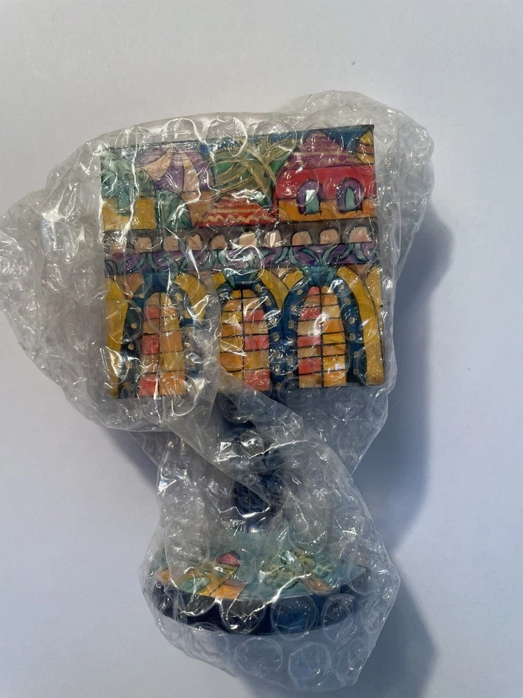 A new and beautiful 4-piece havdala set: tray, candle holder, spice box (b'samim), and cup. Hand painted.Still in its original box and packaging--never used. The original packaging was removed only once, to take these photographs, then immediately restored. For a description of the condition, please see above and the pictures provided. Items are shipped via USPS ground advantage, to the US only. Items are sold AS IS NO RETURNS. Packed well with ample bubble wrap and sturdy cardboard. I combine orders to save you shipping costs. Enjoy!