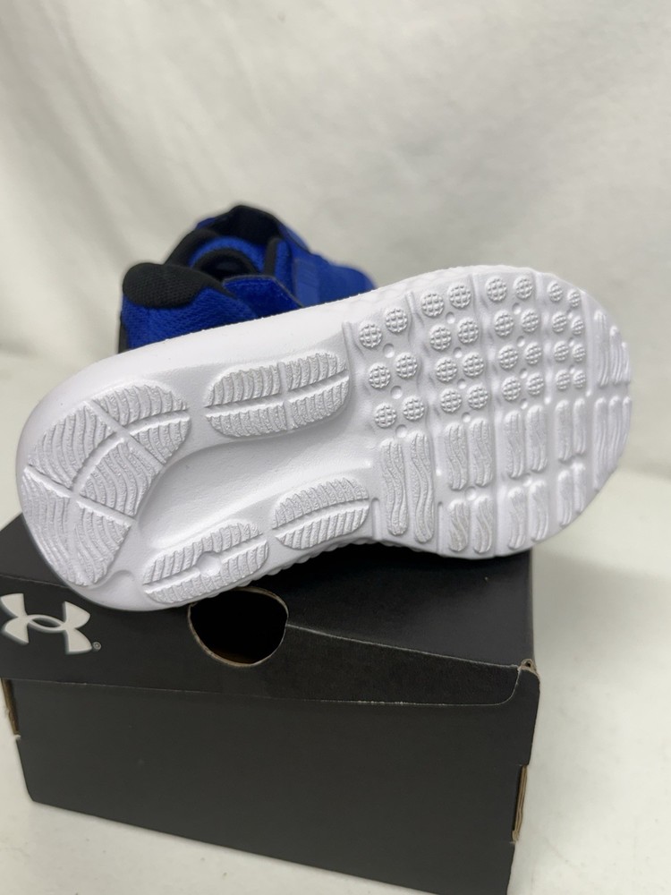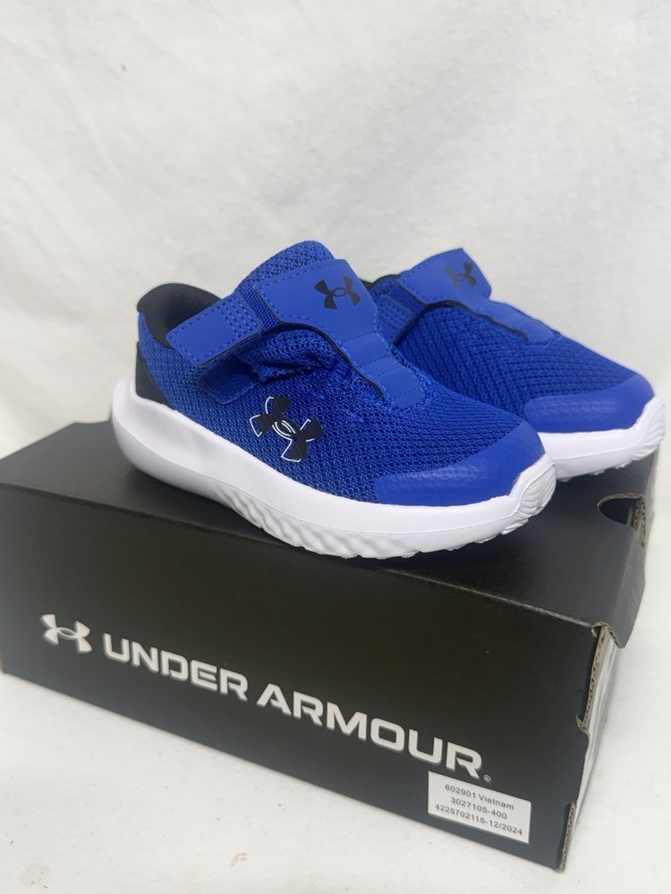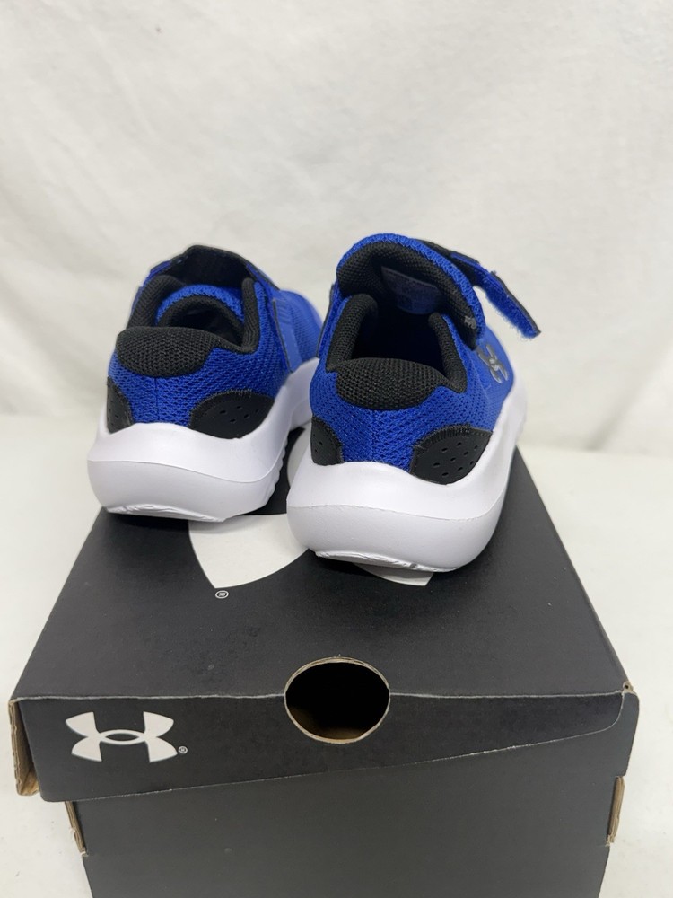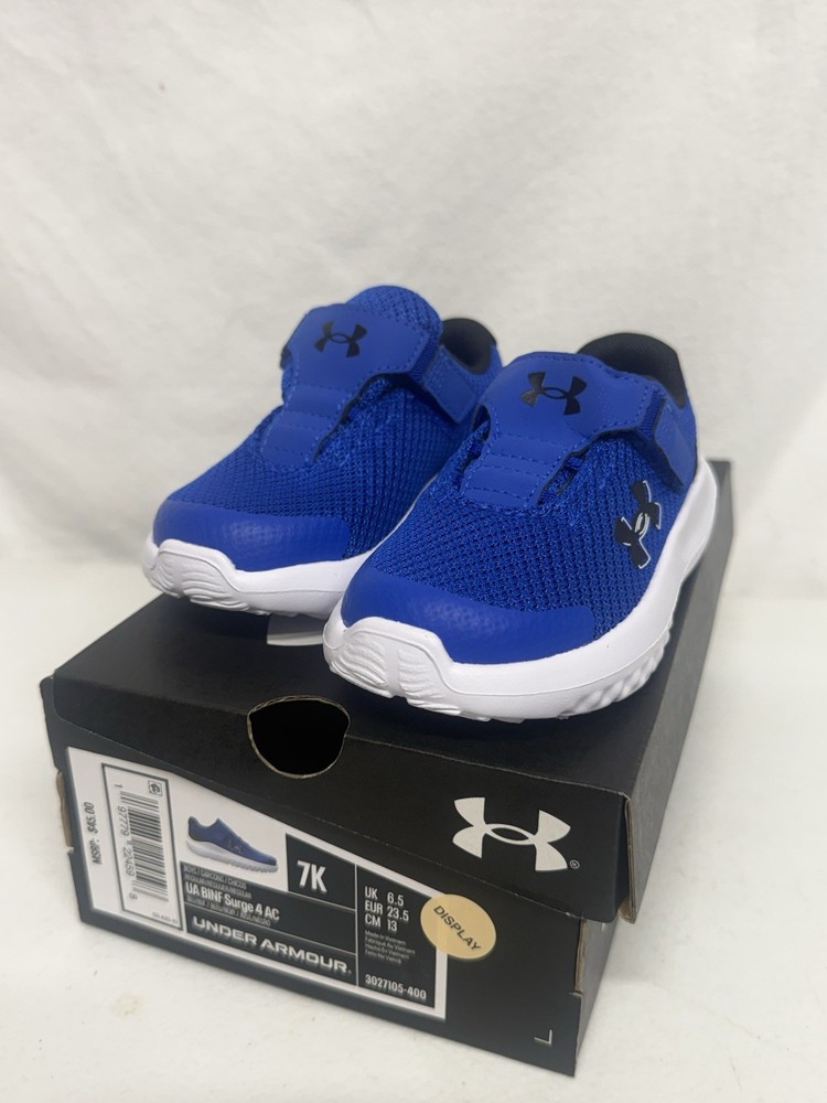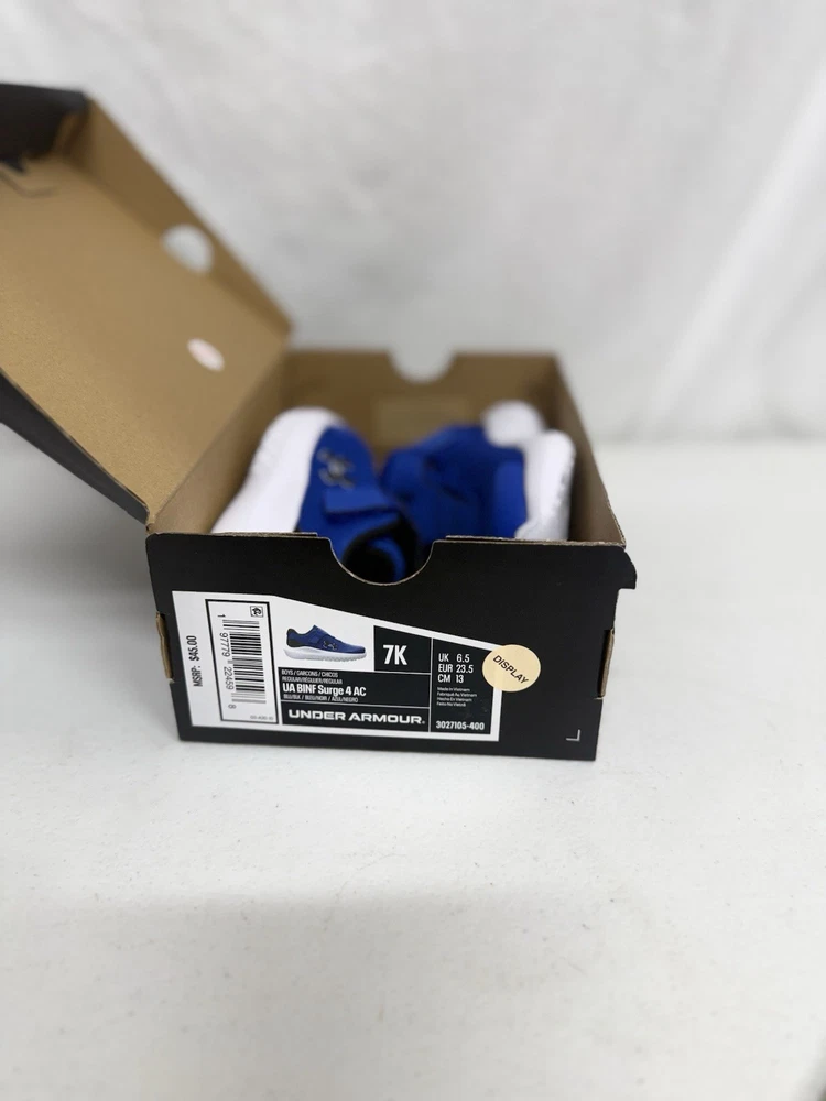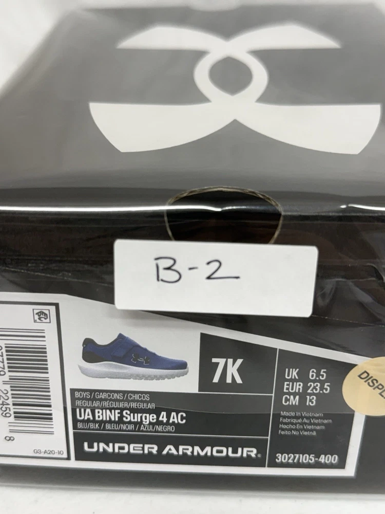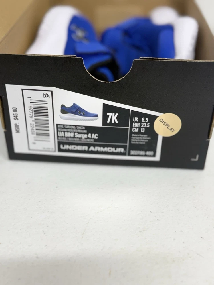 The product is a pair of Under Armour UA Boys Blue BINF Surge 4AC Athletic Shoes in size 7K. These shoes feature a round toe shape, slip-on closure, and a flat heel. Made with a breathable mesh fabric, they are lightweight and suitable for various activities such as walking, school, and running. The shoes are designed for unisex kids and come in a solid blue color with the Under Armour logo as accents. These shoes will be shipped in original box Inside polymailer. (B2)