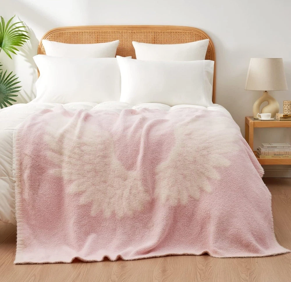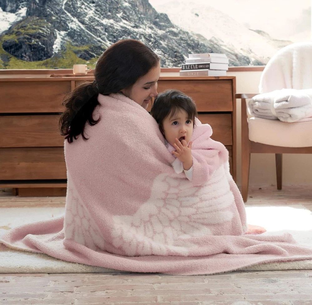 ANGLE WINGS BLANKET: Snuggle Sac angel wings throw blanket is very pretty and matches all the other decorations. You can wrap this blanket around your shoulders, and it looks like the wings are wrapping around you. It would be a wonderful gift for someone who loves angels or someone who needs the soft comfort of a blanket that looks like your angel hugging you. MICROFIBER NITTED THROW: Snuggle Sac fuzzy blanket is made of premium microfiber feather yarn, and it's extremely soft and comfortable with a buttery smooth texture, making you feel like you’re wrapped in a cloud. Soft, stretchy, lightweight, durable, and stylish colorways. Suitable for all seasons! The angel wings and edges are made to look like feathers. SUMMER THROW BLANKET: 30" X 40" throw blanket for babies and kids. The blanket is not thick, so it's the perfect weight for summer when the AC is on and you want to lay on the couch and watch a movie. The color is muted that can pair well with pinks, purples, grays, and other colors. EXQUISITE GIFTS: Our blankets are wrapped with a bow ribbon. It is a good gift for expressing your love. This soft blanket is a great gift choice for birthdays, Christmas, Valentine's Day, and Thanksgiving to friends, colleagues, and family. EASY CARE - Not only it looks and feels amazing, but it's also very durable and easy to maintain. We recommend washing in cold water with a gentle detergent (no fabric softener). Tumble dry on your lowest dryer setting with low heat (do not iron).