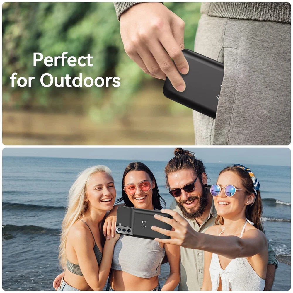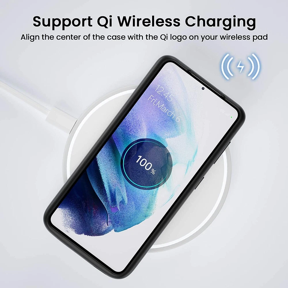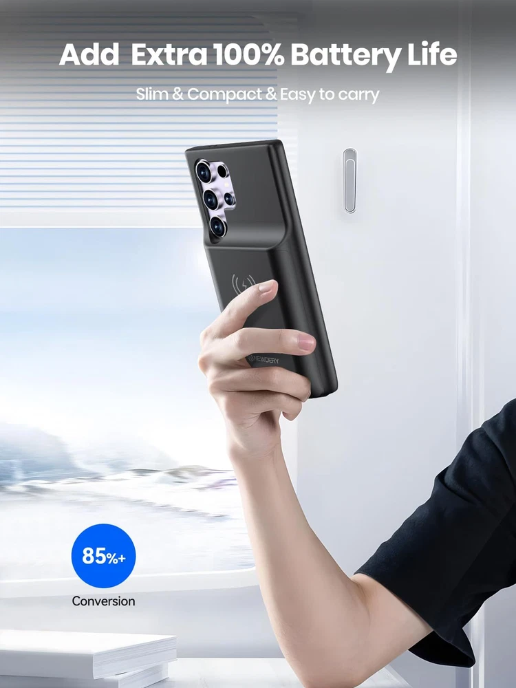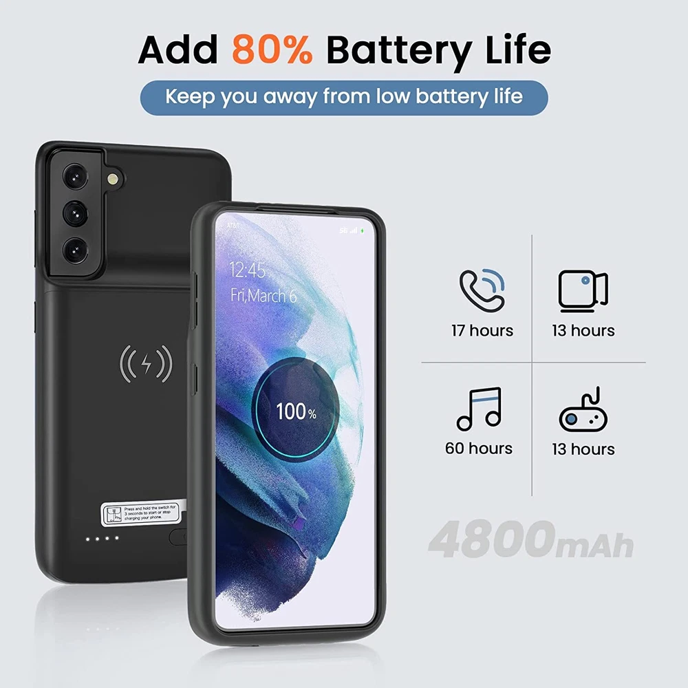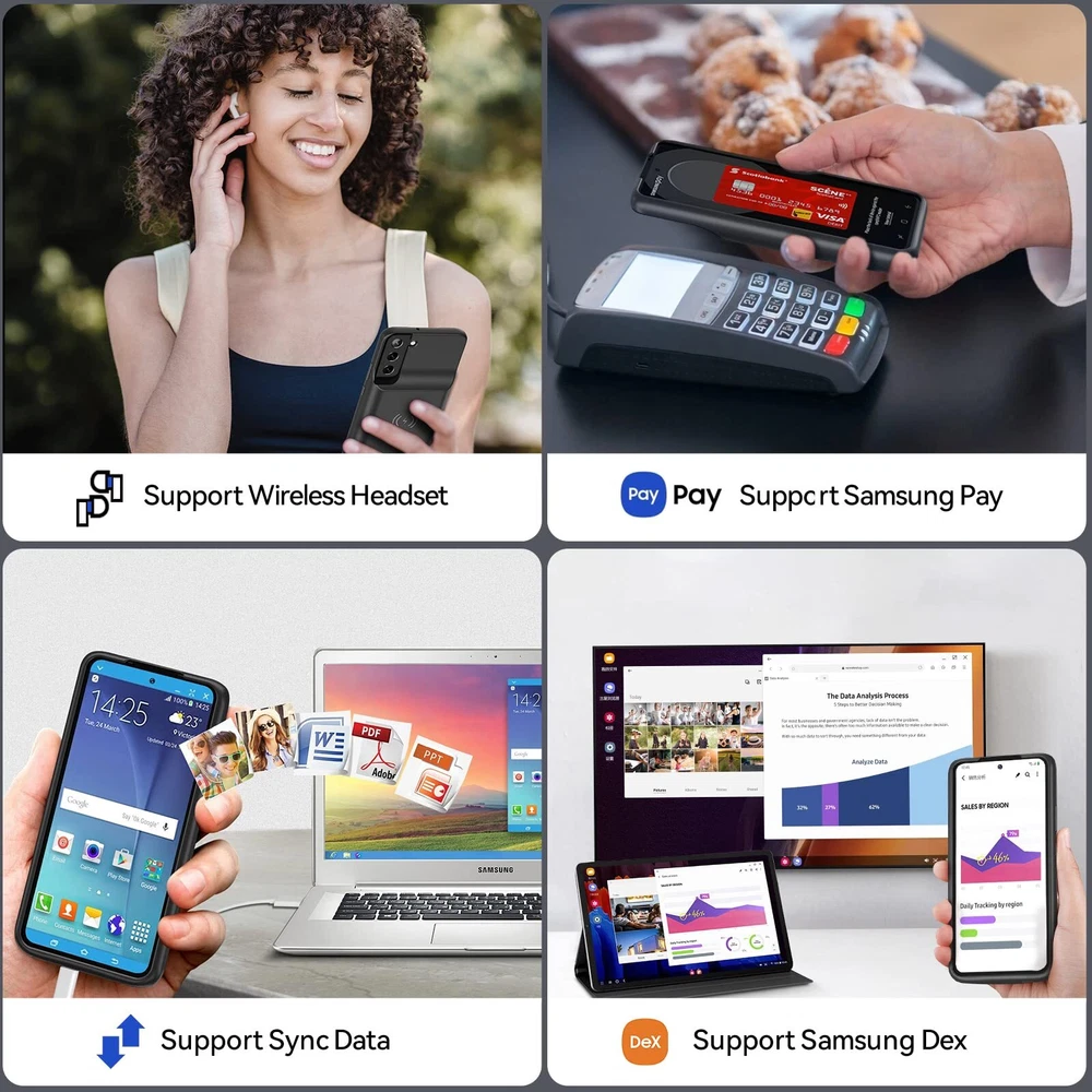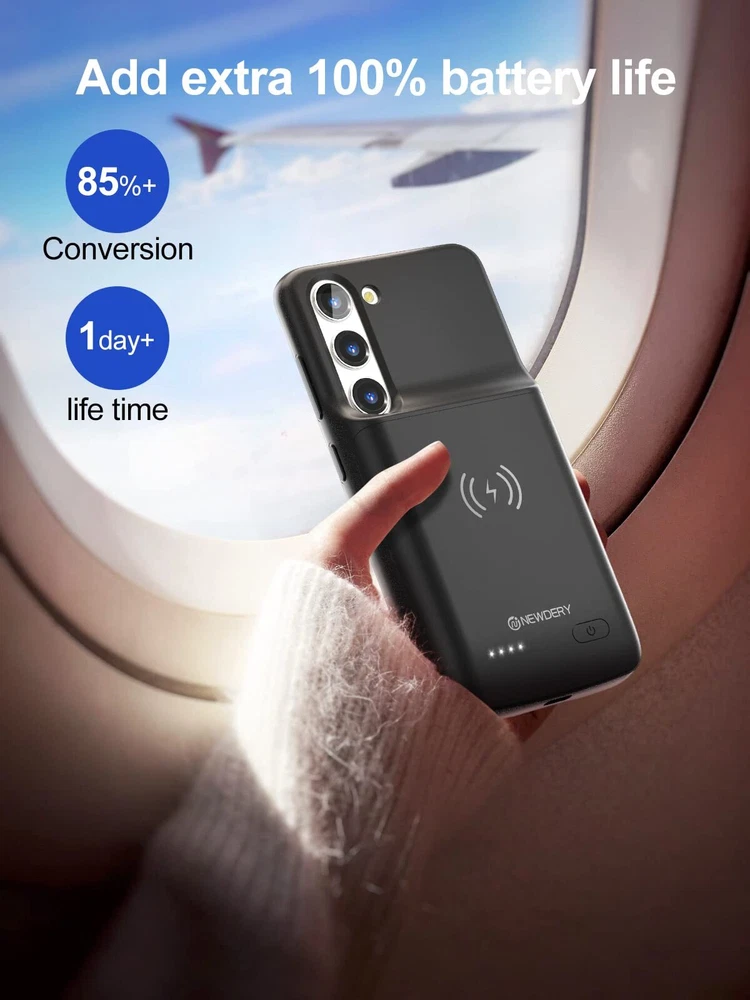 ================================ 【Qi Wireless Charging & Bluetooth headphones Supported】Newdery galaxy S21 S22 S23 S24 battery case allows you to charge the case and your phone simultaneously via Qi wireless charging pad (not included).ONLY support Bluetooth wireless headphones. 【EXTENDED 100% BATTERY LIFE】Samsung S21 S22 S23 S24 slim backup case battery with built-in 4700 or 4800 mAh rechargeable Li-polymer battery pack, doubles your battery life. The galaxy S21 S22 S23 S24 extended case is great for go shopping and travel. 【LED Indicator Light】All-in-One charging case makes convenience. If you charge your phone via Phone battery case at the first time, please hold the power button for 3s to start charging. Besides, it's convenience to track how much power left through ONE-clicking power button. 【360° PROTECT YOUR PHONE】Newdery Battery charger case is not only a portable power bank, but also a protective case for cellphone from scratches. Raised bezels help you to protect the screen to some extent. Please still add a protectors to your phone to prevent it from facing drops. Product Specifications: Capacity: 4700mAh or 4800mAh Input: USB-C DC 5V/1.8A (MAX) Wireless DC 5V/1A (MAX) Output: USB-C DC5V/1.5A (MAX) Battery case fully charges the phone: 2h To fully charge the battery case: 3.3h To fully charge the battery case via wireless charging pad: 4h To fully charge the battery case and the phone: 5.3h Dimensions:6.18*3.07*0.71 inch DOES NOT compatible with type-c headphones. DOES NOT support Data Sync/Samsung Pay/Android Auto/CarPlay. DOES NOT support magnetic/High Voltage, Quick Charge adapters. Charging via cable/Wireless station: You can charge the phone external battery case with phone via the original charging cable at the same time. And Newdery phone charging case can be charged via the Qi wireless pad without take off the case. What do you get Samsung Battery Case x 1 User Manual x 1 Card x 1 Easy to Use Slide your phone in slowly, make sure the connector of the Phone charger case with phone properly. Press the button for 3s to begin/stop charging your phone If you need to take it off, bend the top soft rubber of the case, then push your phone up slowly.