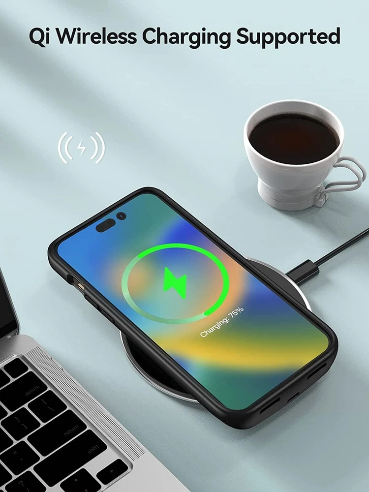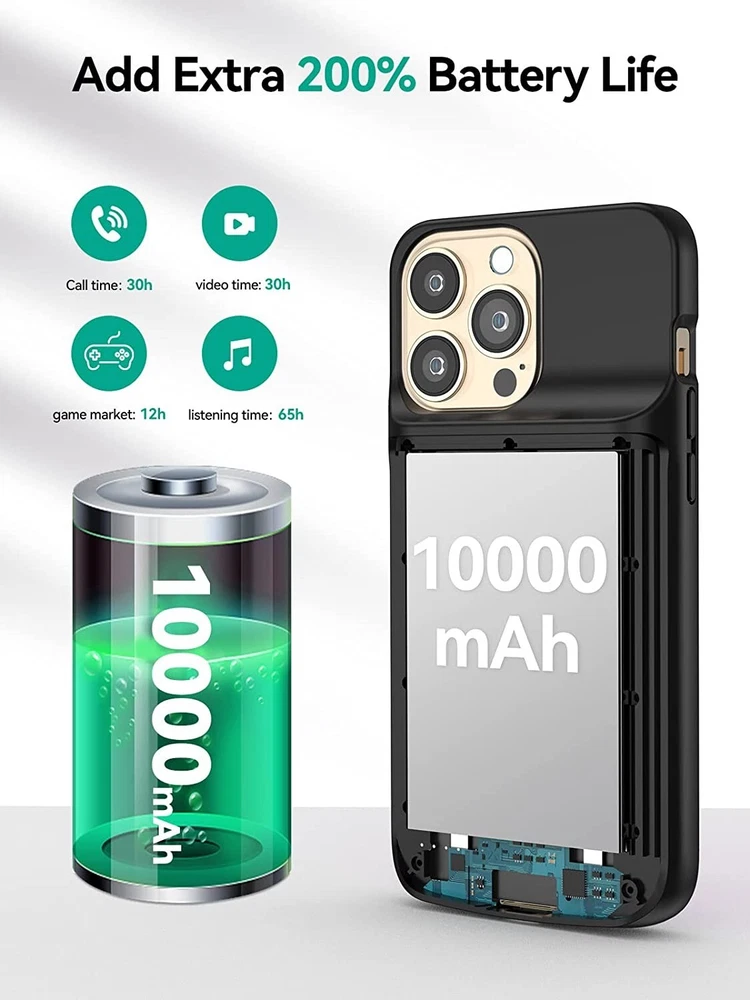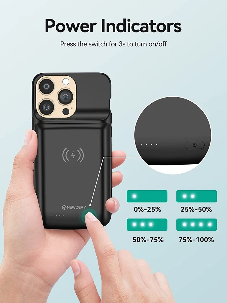 [Compatibility] This battery case only fits for iPhone 14 Pro, iPhone 14, iPhone 13 Pro, iPhone 13 6.1 inch. Doesn't fit for iPhone 14 Plus, iPhone 14 Pro Max, iPhone 13 Pro Max. Please check your phone model before buying. [10000mAh Powerful Capacity] The battery case for iPhone 14 Pro equipped with 10000mAh battery, extended 200% battery life to your phone. Let you get rid of the anxiety about battery electricity anytime, anywhere. [Advanced Wireless & Wired Charging] You can charge the charger case and for iPhone 14 simultaneously via Qi charging pad or original charging cable(not included), and phone will be recharged first. [Wired earphone & Sync-data & Apple Pay Supported] The charging case for iphone 13 Pro support wired& wireless earphone and Apple Pay function. You can conveniently transfer files to your Macbook, PC or laptop and don’t need to take the battery case off. Make your life more convenient. [Easy To Use & Smart Indicators] Bend the soft rubber top and slide your phone into the iphone 13 extended case charger, press the button for 3s to start / stop charging. Press the button for once to check the percent of charge available via the led indicators. [What You Will Get] 1* Battery case for iPhone 14 Pro/14 /13 Pro/13, 1* User manual, 24h professional and friendly support,If you have any problem with our product, we will be more than happy to assist. NEWDERY 10000mAh Portable Qi Wireless Charging Supported Rechargeable Battery Case for iPhone 14 Pro/14/13 Pro/13 6.1 inches 1. Designed for iPhone 14 Pro, iPhone 14, iPhone 13 pro, iPhone 13(6.1inch).(NOT for iPhone 14 Plus,iPhone 14 Pro Max,iPhone 13 Pro Max). 2. Built-in 10000mAh Li-ion battery, add 200% battery power to your phone. 3. Support wired earphone, Bluetooth earphone, no need to remove the battery case for iphone 14 pro when enjoying music, movie and video. 4. Qi wireless charging, sync data, Apple pay supported. NOTE: DOESN'T SUPPORT MAGNETIC charging. 5. Soft TPU material and sleek back up offers a great grip experience. 6.This battery case is compatible with carplay via Bluetooth and usb to iPhone cable. 7.Please use USB A to ios charging cable to sync data. 8. Doesn't support fast charger. Please use a 5V/1.5A adapter to charge the case. Easy to Use 1. Bend the soft part of the charging case for iphone 14 pro. 2. Slide your phone into the battery case for iPhone 13, lining up the connector of your phone with the connector of the charger case. 3. Press the button for 3s to begin/stop charging your phone. 4. One-Click the power button to know the power level.
