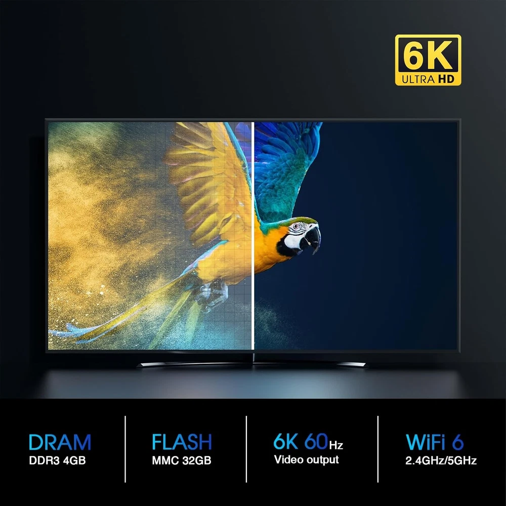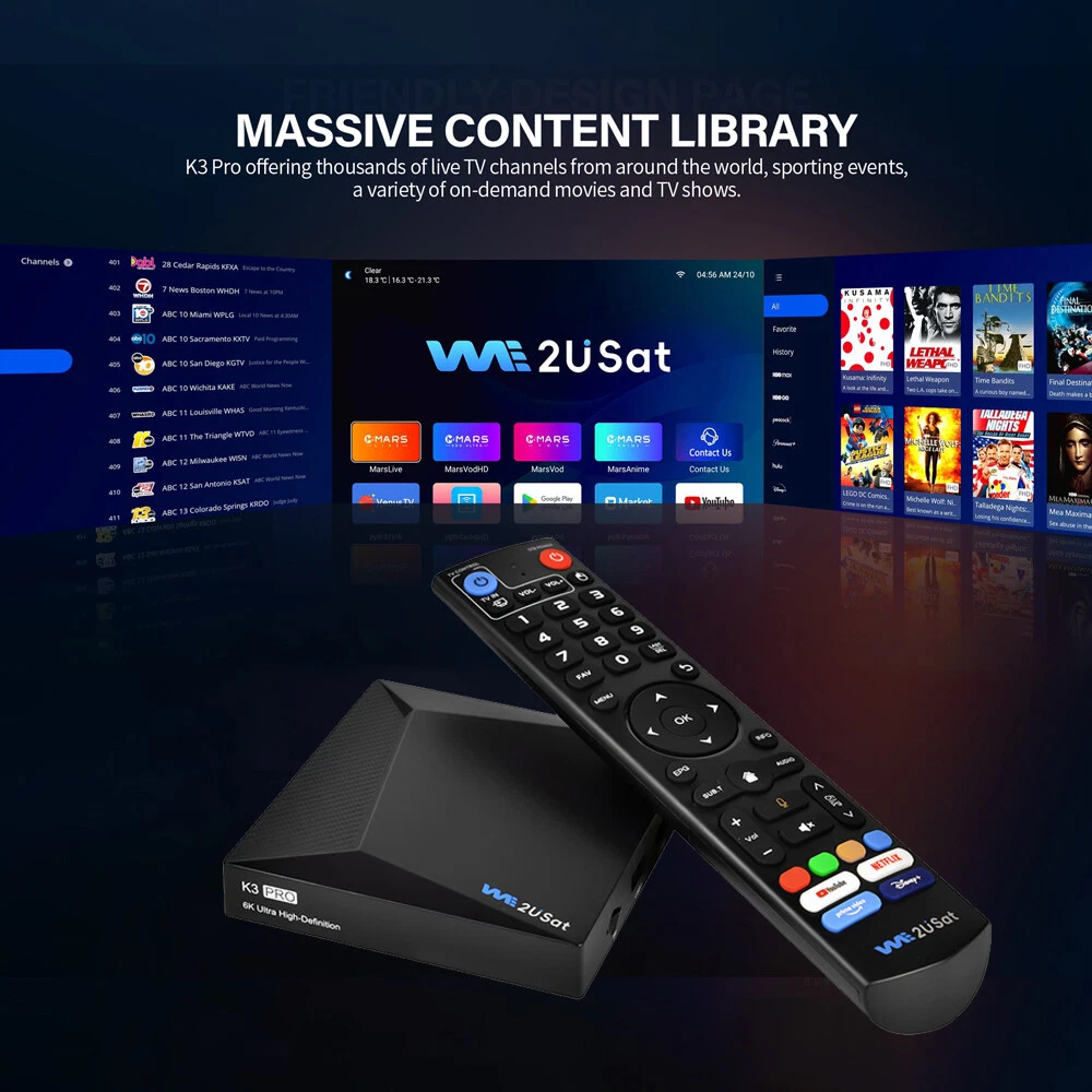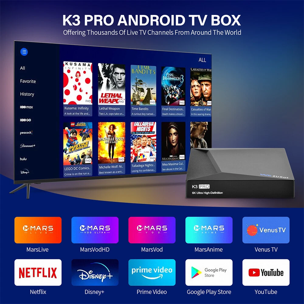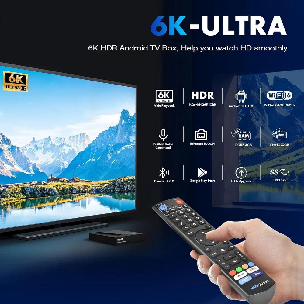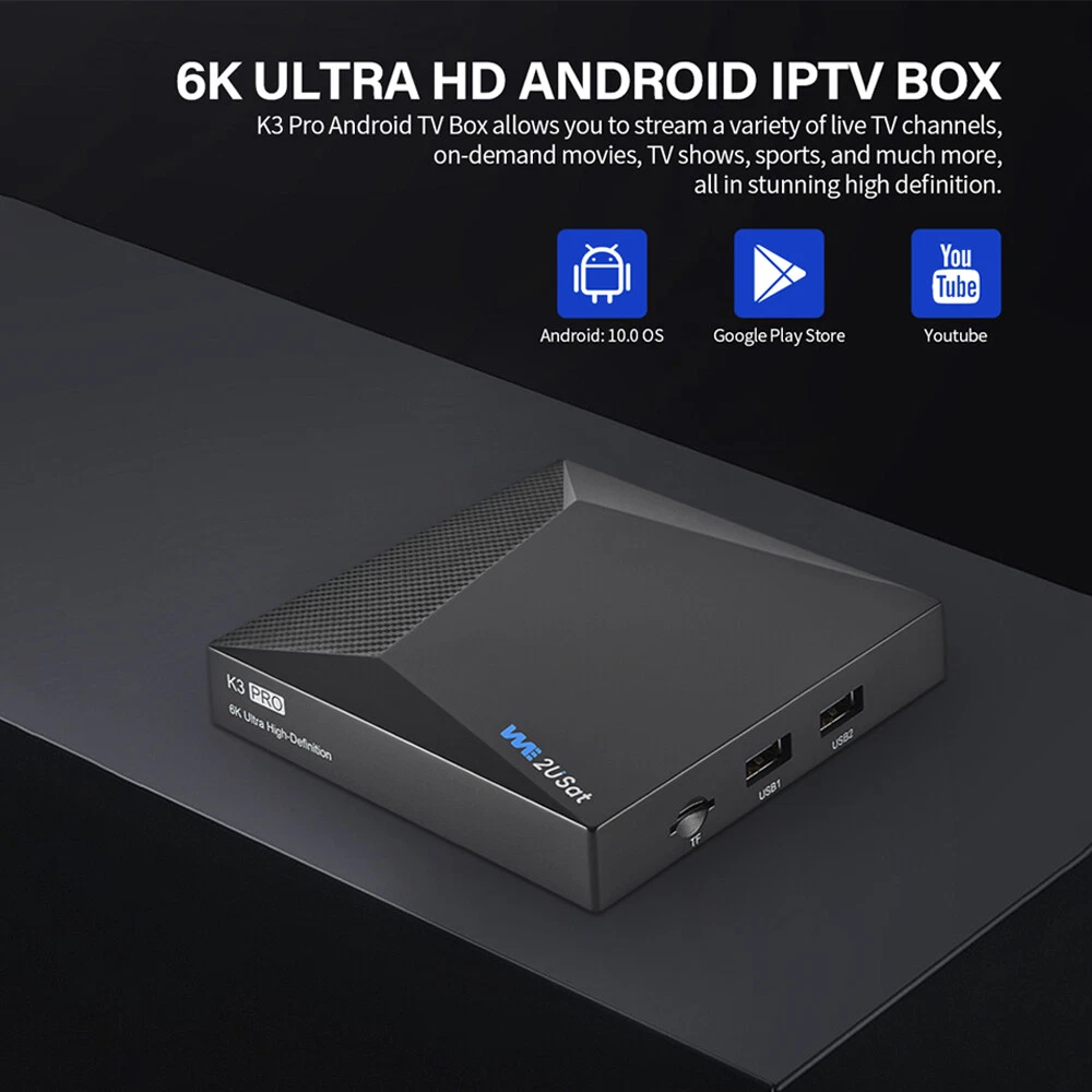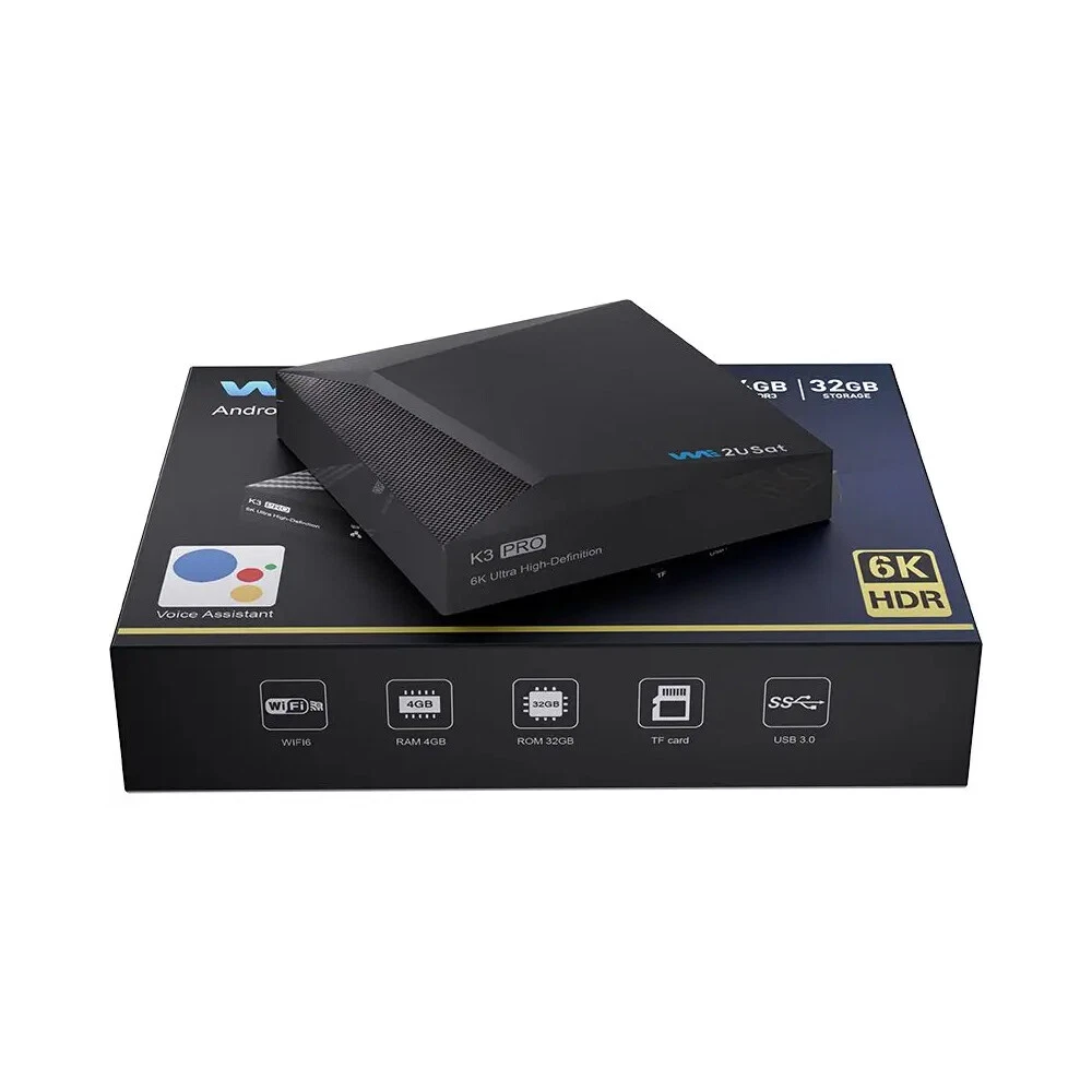 Product Description: 1. Quad Core 64 bit 6K HDR Android TV Box 2. Android base TV system 3. H.264 1080p 60fps Video encoding 4. H.264/H.265 10bit HDR decoding up to 6K@60fps 5. HDMI 2.0 max to 6K60 output Highlight: 1. Support Network Streaming 2. Support 2500+ TV Control 3. Support Multi-screen interactive 4. Support Local Media Playback 5. Support TV APP 6. Support External Storage--USB storage max to 2TB (FAT32/NTFS) 7. Support System Upgrading Hardware: CPU: Quad-core ARM Cortex™-A53 GPU: Mali-G31 DRAM: DDR3 4GB FLASH: EMMC 32GB OS: Android Q(10.0) Network: RJ45 Interface 10M/100M/1000m adaptive Build in WiFi-6 2.4GHz/5GHz 802.11a/b/g/n/ac/ax + BT 5.0 Package Include: 1 x K3 PRO TV BOX 1 x HDMI Cable 1 x Voice Remote Control 1 x User Manual NEWEST SUPER BOX S6 MAX/V See Box V6 PLUS/WE2USAT K3 PRO 6K-Ultra Smart TV Box Product Description: 1. Quad Core 64 bit 6K HDR Android TV Box 2. Android base TV system 3. H.264 1080p 60fps Video encoding 4. H.264/H.265 10bit HDR decoding up to 6K@60fps 5. HDMI 2.0 max to 6K60 output Highlight: 1. Support Network Streaming 2. Support 2500+ TV Control 3. Support Multi-screen interactive 4. Support Local Media Playback 5. Support TV APP 6. Support External Storage--USB storage max to 2TB (FAT32/NTFS) 7. Support System Upgrading Hardware: CPU: Quad-core ARM Cortex™-A53 GPU: Mali-G31 DRAM: DDR3 4GB FLASH: EMMC 32GB OS: Android Q(10.0) Network: RJ45 Interface 10M/100M/1000m adaptive Build in WiFi-6 2.4GHz/5GHz 802.11a/b/g/n/ac/ax + BT 5.0 Package Include: 1 x K3 PRO TV BOX 1 x HDMI Cable 1 x Voice Remote Control 1 x User Manual