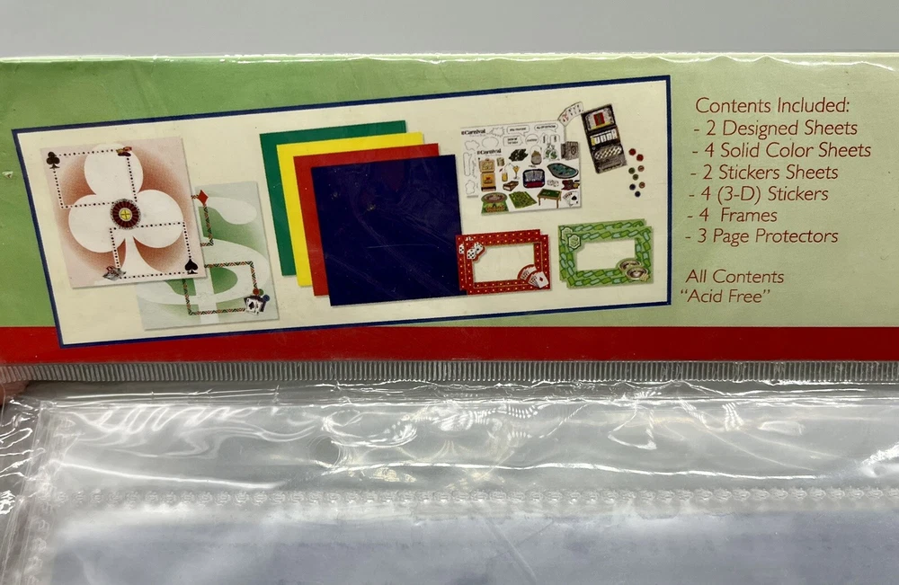 NEW/SEALED Carnival Cruise Lines Casino Scrapbook Bundle Kit for Photo Albums Acid Free Kit Contains: 2 Designed Sheets 4 Solid Color Sheets 2 Sticker Sheets 4 Puffy 3-D Stickers 4 Printed Paper Frames 3 Page Protectors