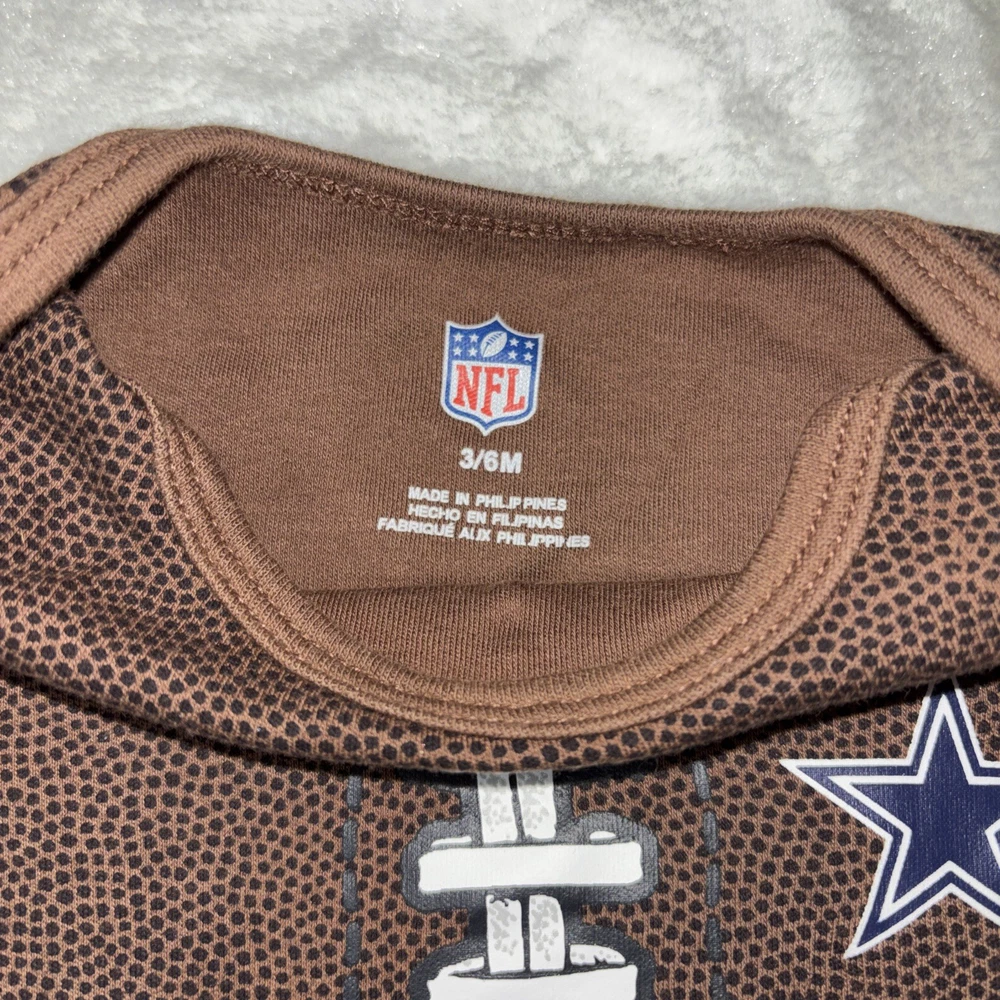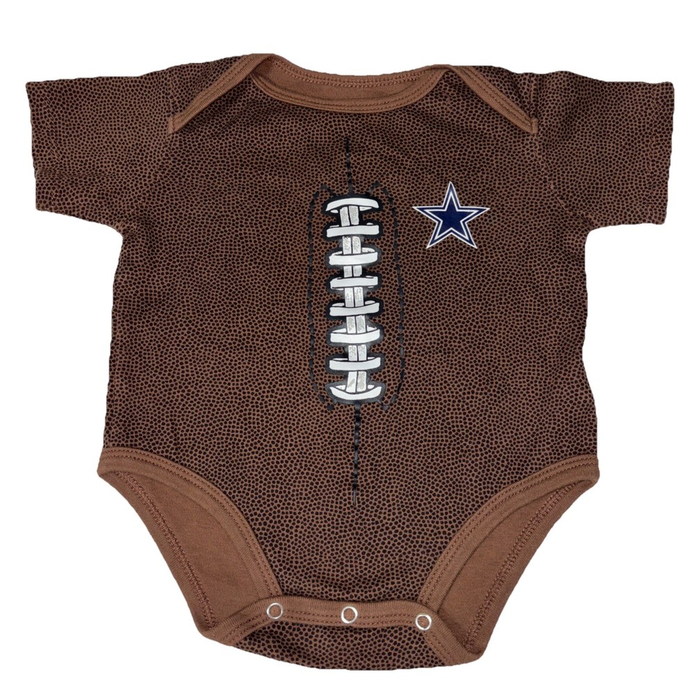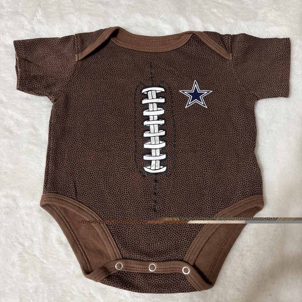 Sleeve Length:Short SleeveSize:3-6 MonthsPattern:footballMPN:Does Not ApplySize Type:RegularNeckline:Crew NeckDesign Features:footballCountry of Origin:ChinaMaterial:CottonModified Item:NoBrand:NFLDepartment:BoysClosure:ButtonStyle:One-PieceMore Info:See below for more detailsType:Outfit/SetTheme:Sports, football, dallas cowboysColor:Brown