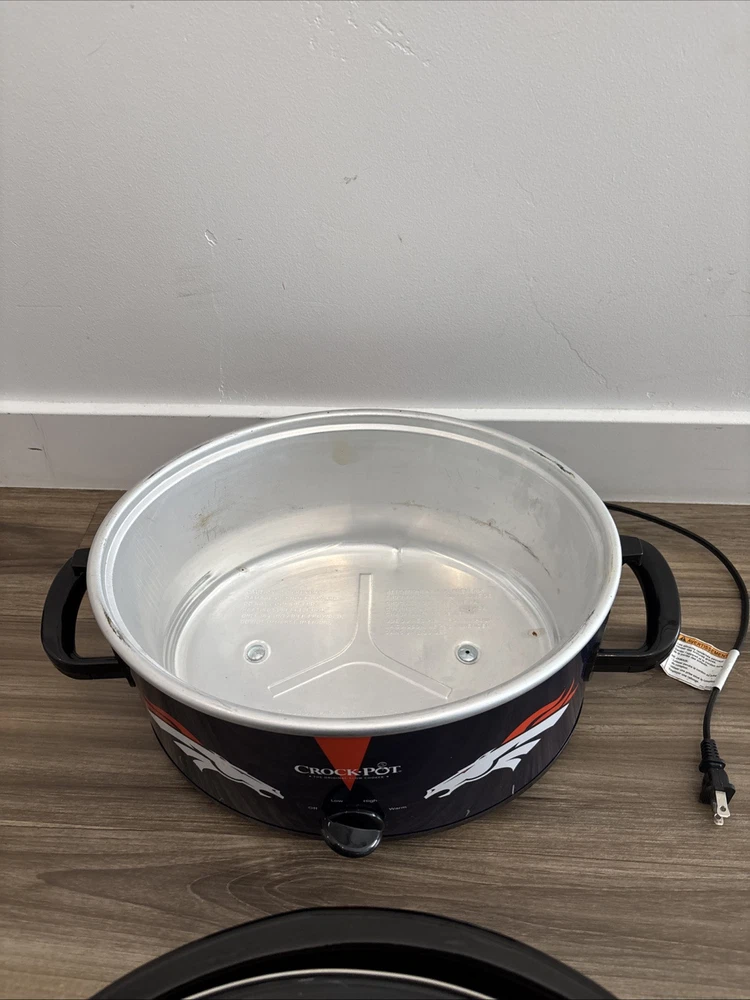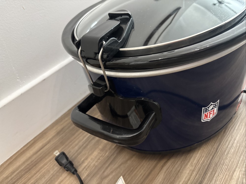 The NFL Crock-Pot Slow Cooker in a 6-quart size features a sleek blue design with a glossy finish, perfect for showcasing team pride for the Denver Broncos. This electric slow cooker operates at 120 volts and 240 watts, offering three settings/programs for versatile cooking options. It includes a locking lid for secure transportation to tailgates or Super Bowl parties, along with a 30-inch cable length for convenient use. The Crock-Pot also comes with a lid as the included component, making it a practical and stylish addition to any kitchen.