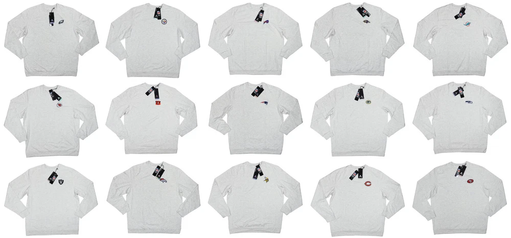 Material: Cotton, Polyester Neckline: Crew Neck Fit: Regular Theme: Classic, Designer, Outdoor, Sports Season: Fall, Spring, Summer, Winter Size Type: Regular Department: Men Brand: NFL Pattern: Solid Type: Sweatshirt Color: Gray Performance/Activity: Baseball, Basketball, Bodybuilding, Cross Training, CrossFit, Cycling, Football, Golf, Gym & Training, Hiking, Hockey, Hunting, Lacrosse, Pilates, Rugby, Running & Jogging, Skateboarding, Soccer, Squash, Tennis, Track & Field, Volleyball, Walking, Yoga Style: Pullover Closure: Pull On Product Line: NFL Crew Neck Sweatshirt Features: Lightweight Accents: Embroidered, Logo Sleeve Length: Long Sleeve Country/Region of Manufacture: India Garment Care: Machine Washable MPN: 77H Fabric Type: Fleece