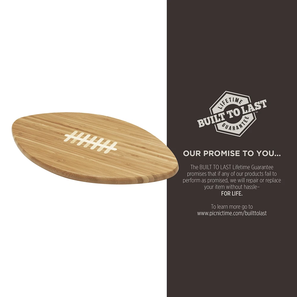 Perfect for game day, this NFL Touchdown Pro! cutting board features gorgeous bamboo construction in a football silhouette and design. This handsome board has inlaid wood "laces" that resemble a professional football. It may be used as a cutting board, serving tray on the buffet, or use both sides of the board, one for cutting and the other for serving. The backside of the board is solid dark bamboo. Measures 15 inches long by 8-3/4 wide by 3/4 inches thick. Great for entertaining, and makes a fabulous gift.. Pizza connoisseurs use pizza peels for transferring their homemade pizzas from the oven Item Color: Natural Wood Decoration: Engraved