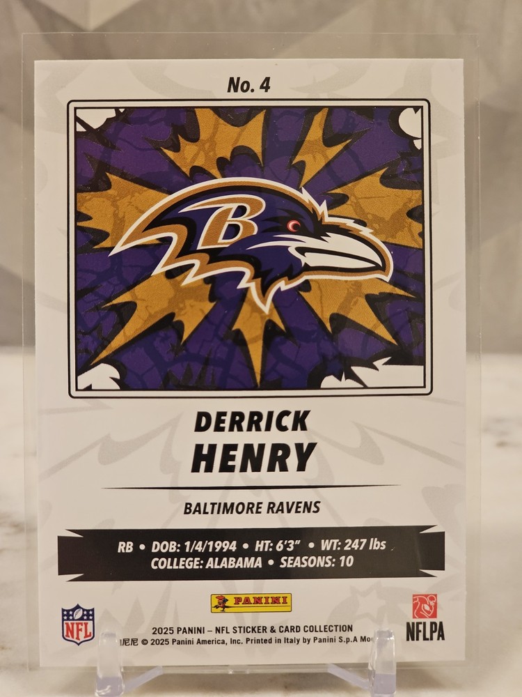 The NFL Sticker Collection 2025 Panini #4 featuring Derrick Henry of the Baltimore Ravens is a highly sought-after sports trading card. Produced by Panini, this sticker card is a part of a set released for the 2025 season of the National Football League. Perfect for football fans and collectors, this card showcases the standout player in a unique and collectible format. With a focus on the talented athlete and his team, this sticker card is a must-have for any fan of the sport.