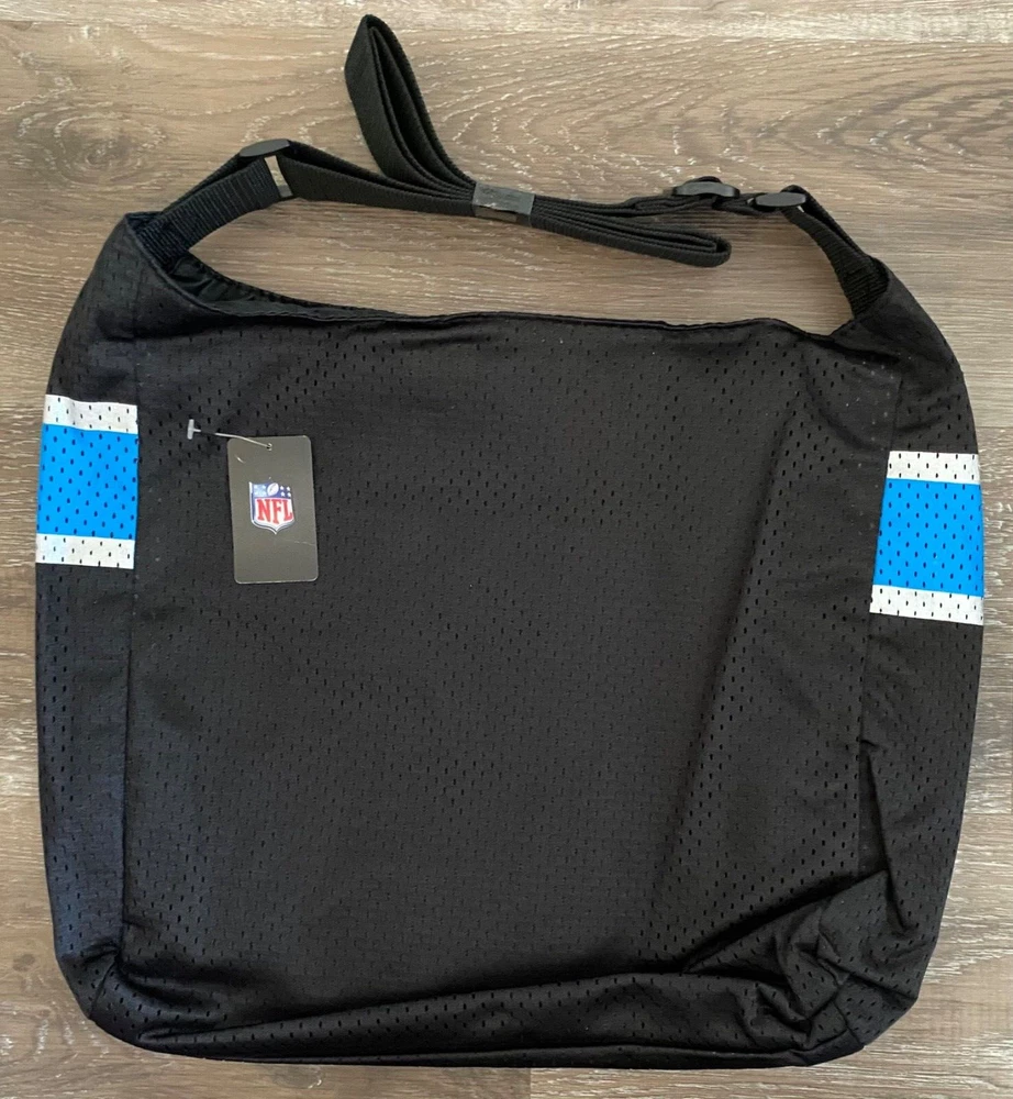 NFL~NEW~Carorlina Panthers Jersey Tote Bag~Black & Blue~NWT *Color: Black with blue & silver panther and stripes *Shoulder strap is adjustable *Bag zips across the top *One small pocket inside *Approximately 13 inches from top of tote to the bottom and 17 inches from side to side *NEW with retail tags attached *We have a smoke free home