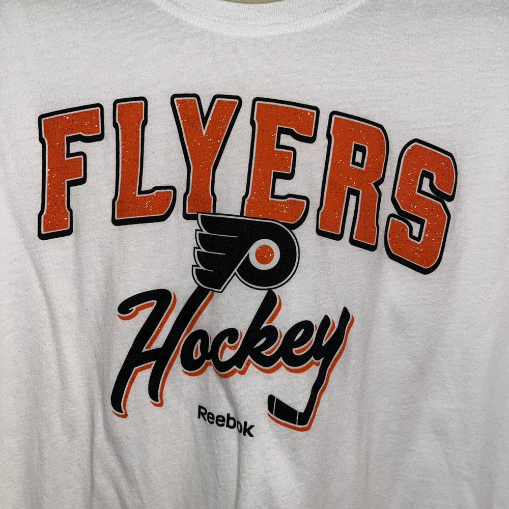 NHL Flyers Hockey Womens Long Sleeve White Tshirt Orange Black Logo Size Large Crew Neck Glitter letters. Look at photos for measurements as this is 100% and has likely shrunk.