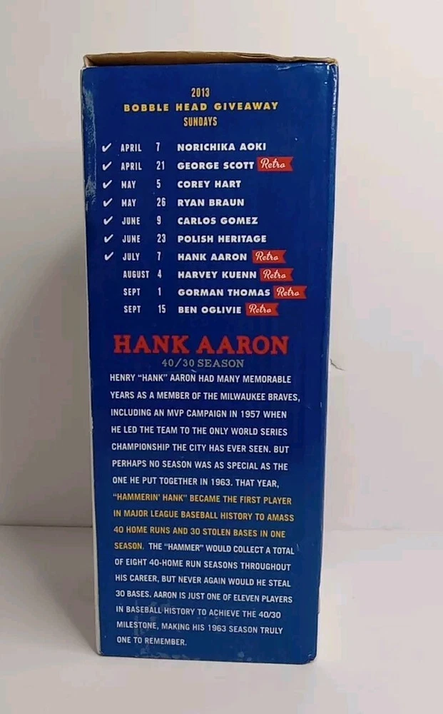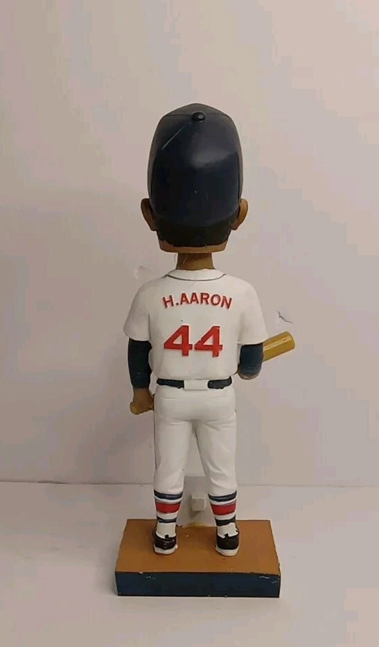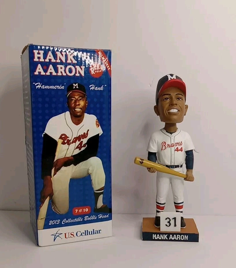 New in box. Some tape on box. As is. This officially licensed, major league baseball bobblehead features the legendary Hank Aaron of the Atlanta Braves. The multi-color design and unisex adult gender make it a perfect addition to any baseball fan's collection. This product is a must-have for any fan of the sport and is perfect for displaying during regular season games. The Bobblehead is in its original packaging (NIB) and is ready to be displayed in your home or office.