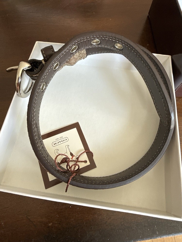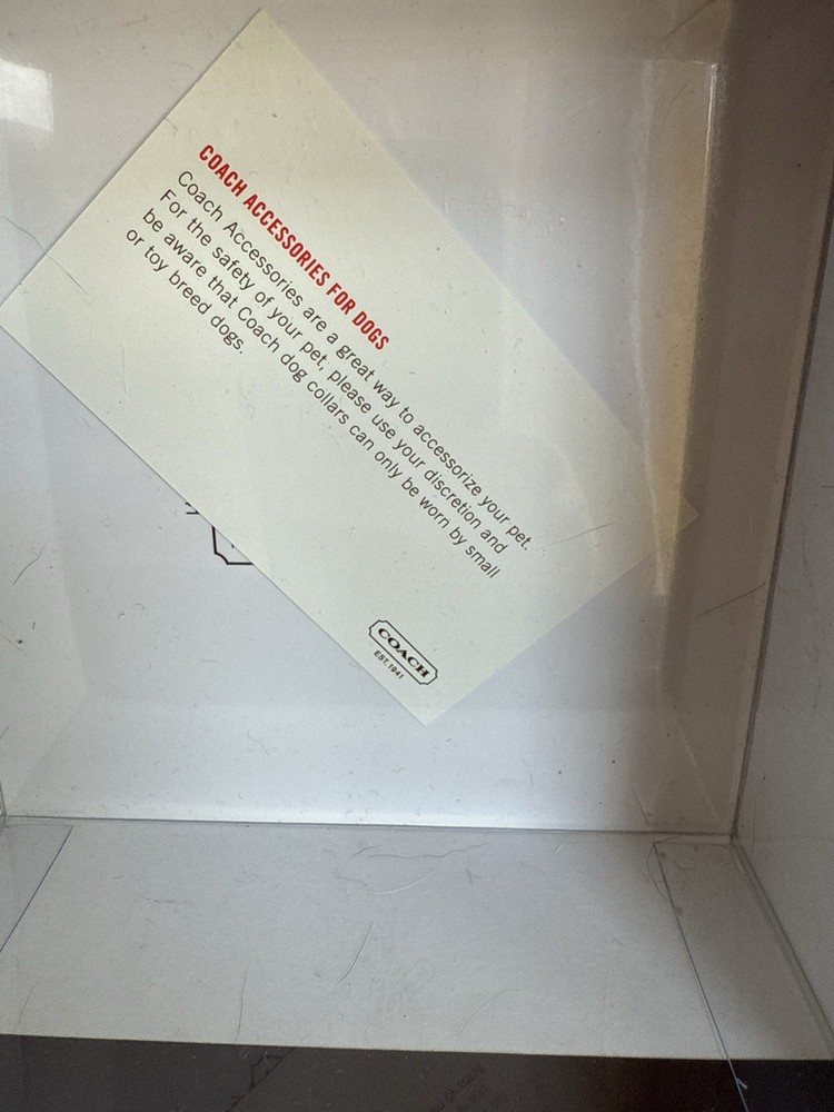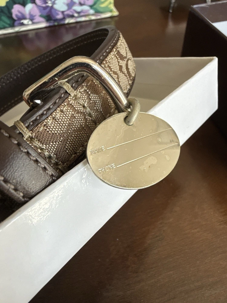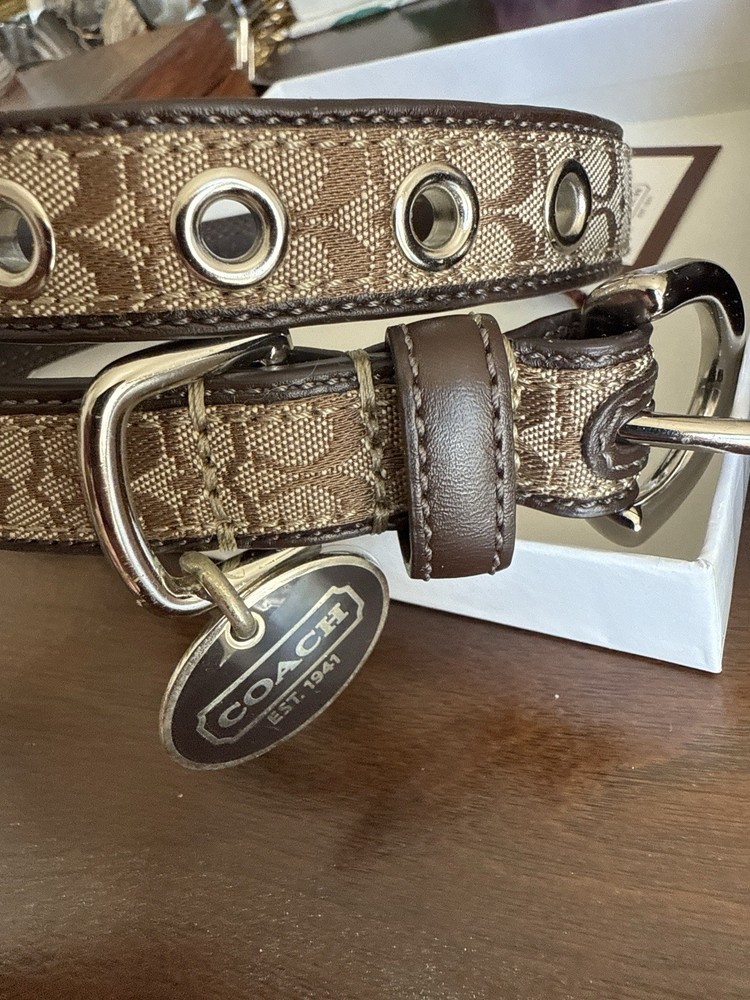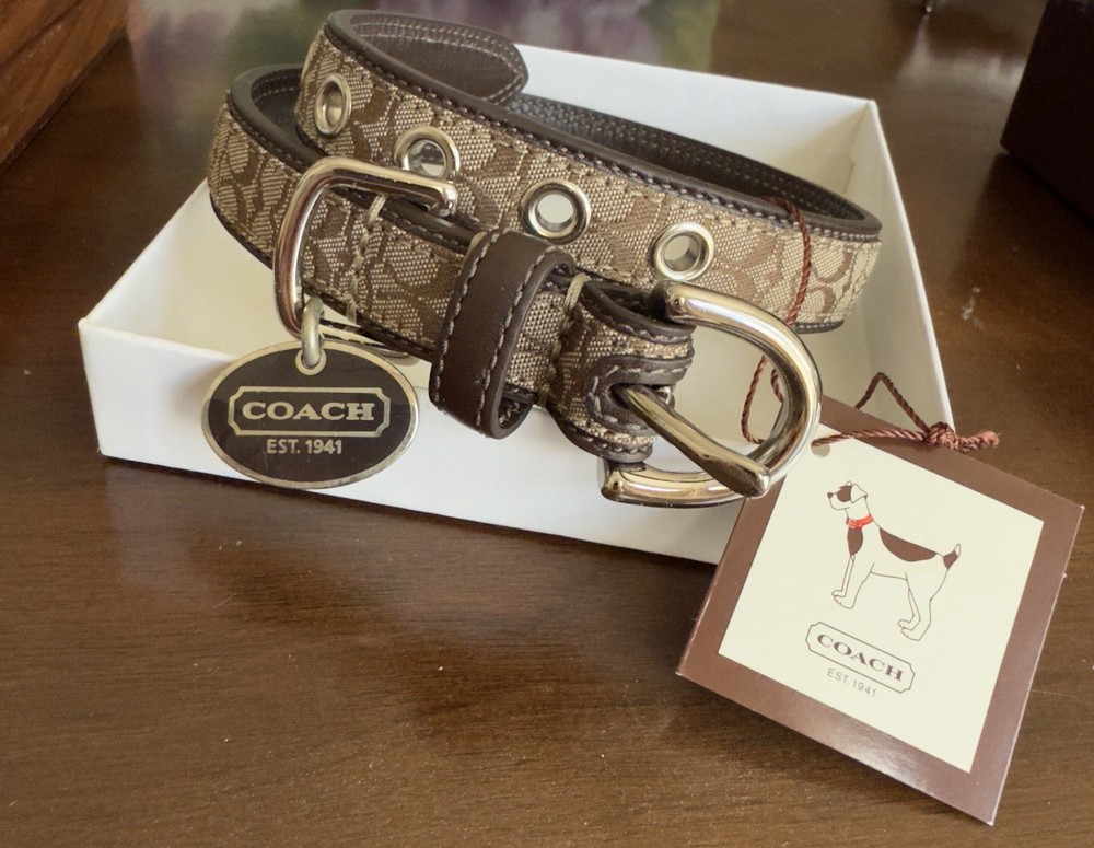 Up for sale is a New In Box (NIB) Authentic Coach Signature Pet Collar. This is a retired, highly collectible style featuring the classic Coach aesthetic and premium craftsmanship. Why This Piece is Special: * 100% Authentic: Genuine Coach (Model 4003) in its original retail packaging. * Premium Materials: Durable khaki signature jacquard fabric outer with high-quality mahogany brown leather backing for your pet's comfort. * High-End Hardware: Features a sturdy nickel buckle and five reinforced adjustment holes with silver-tone grommets. * Complete Set: Comes exactly as pictured with the original illustrated Coach gift box and the signature oval enamel charm. Measurements: * Size: Medium (M) * Fit: Designed for neck sizes 13.5" to 16.5". * Strap Width: 1 inch. The back bottom of the box has a minor scratch as shown in pics