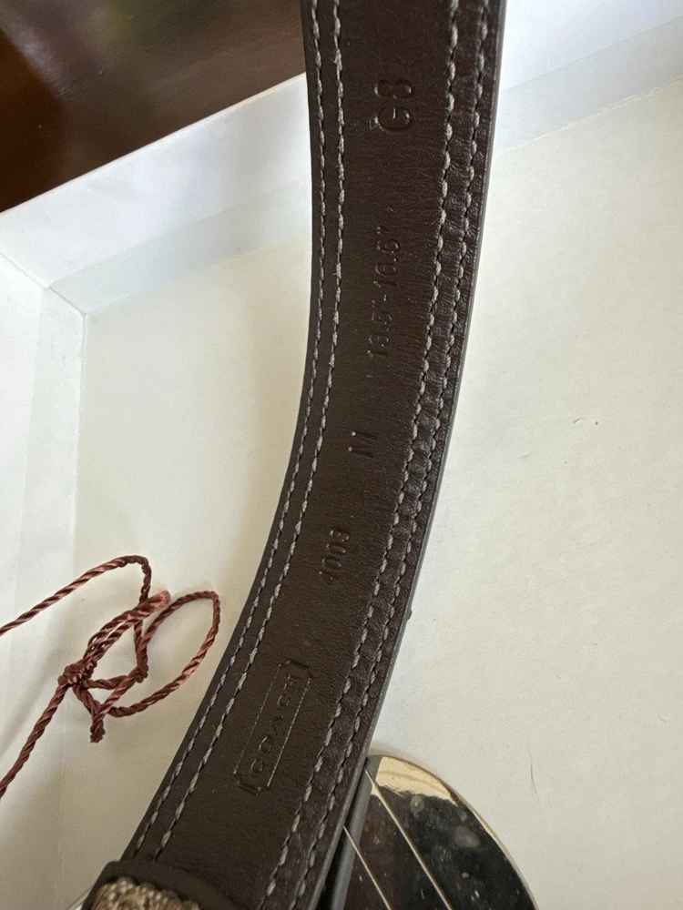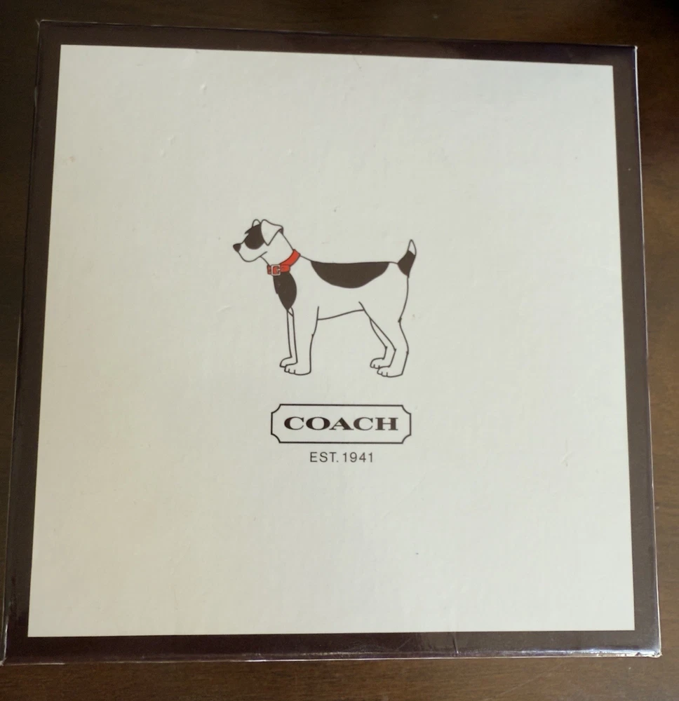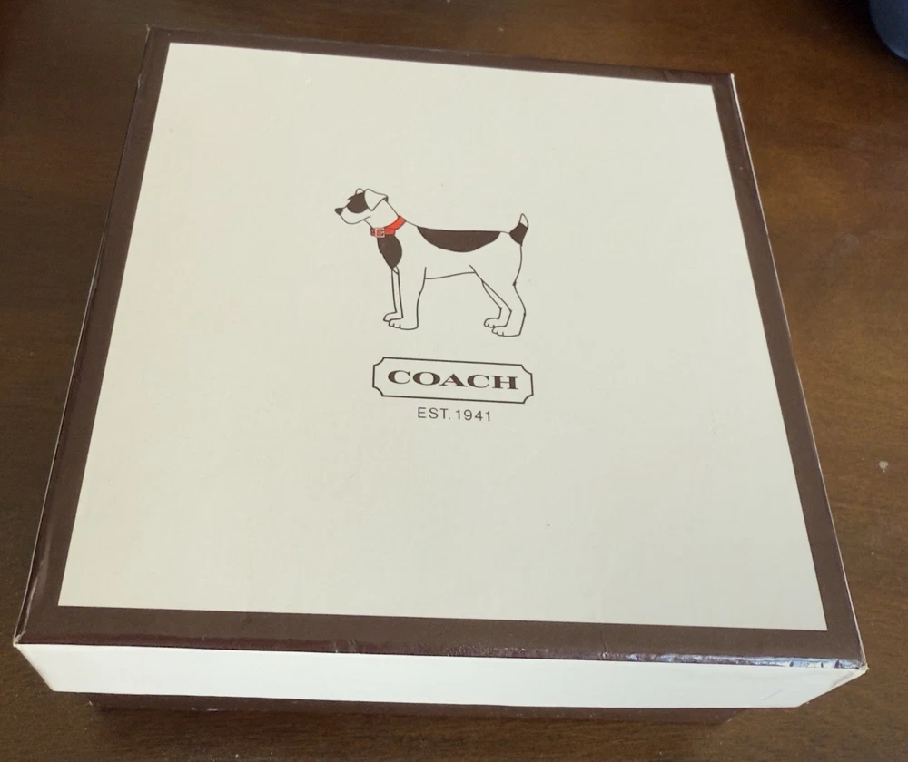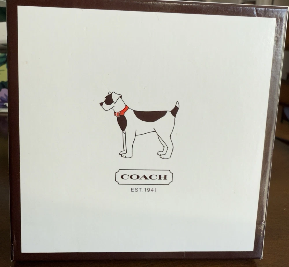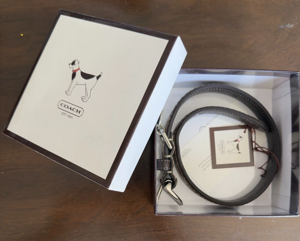Up for sale is a New In Box (NIB) Authentic Coach Signature Pet Collar. This is a retired, highly collectible style featuring the classic Coach aesthetic and premium craftsmanship. Why This Piece is Special: * 100% Authentic: Genuine Coach (Model 4003) in its original retail packaging. * Premium Materials: Durable khaki signature jacquard fabric outer with high-quality mahogany brown leather backing for your pet's comfort. * High-End Hardware: Features a sturdy nickel buckle and five reinforced adjustment holes with silver-tone grommets. * Complete Set: Comes exactly as pictured with the original illustrated Coach gift box and the signature oval enamel charm. Measurements: * Size: Medium (M) * Fit: Designed for neck sizes 13.5" to 16.5". * Strap Width: 1 inch. The back bottom of the box has a minor scratch as shown in pics