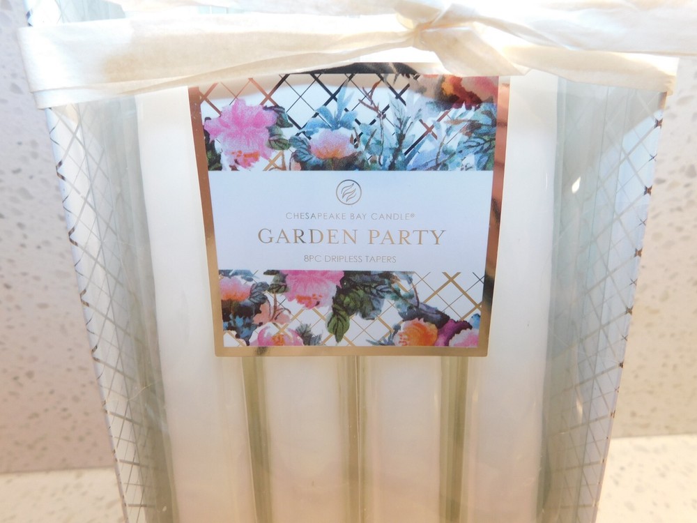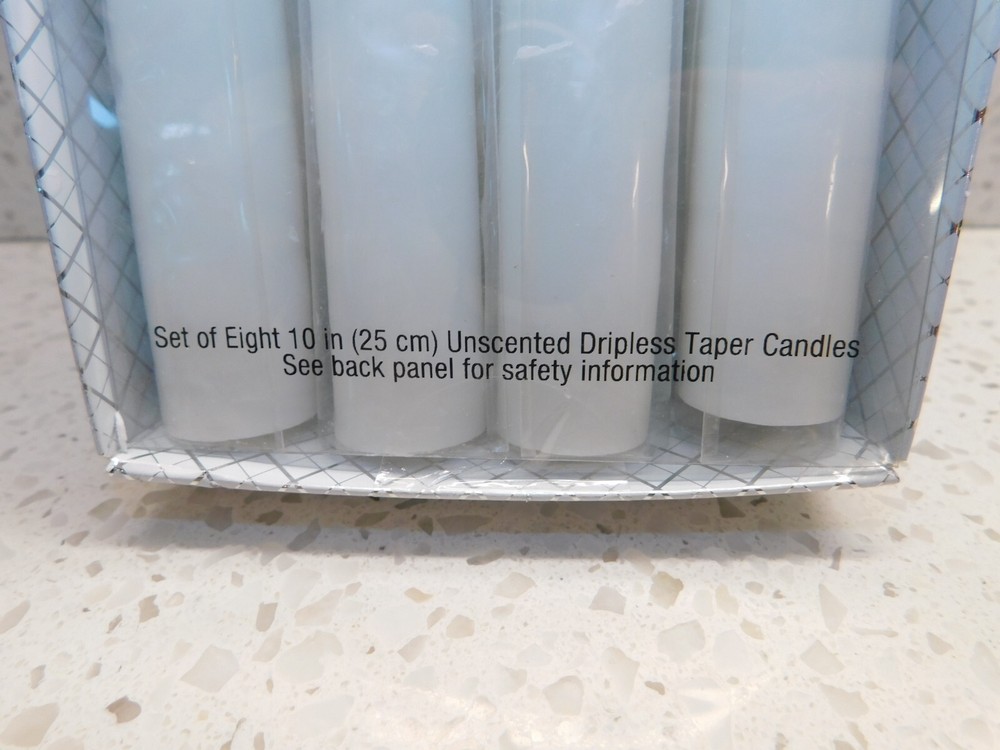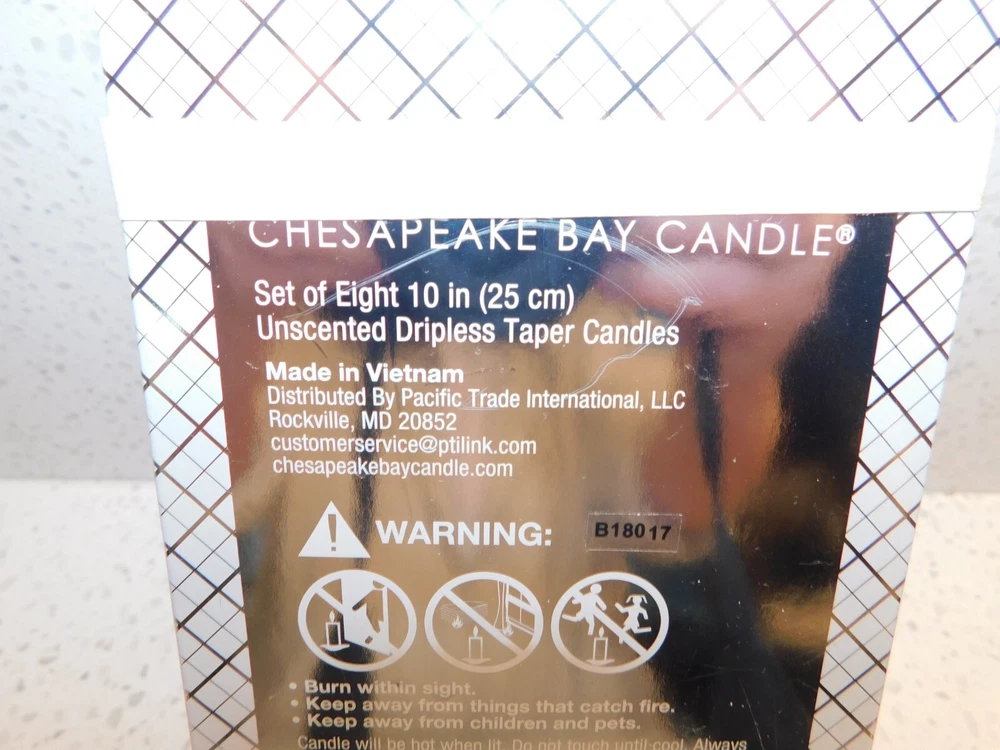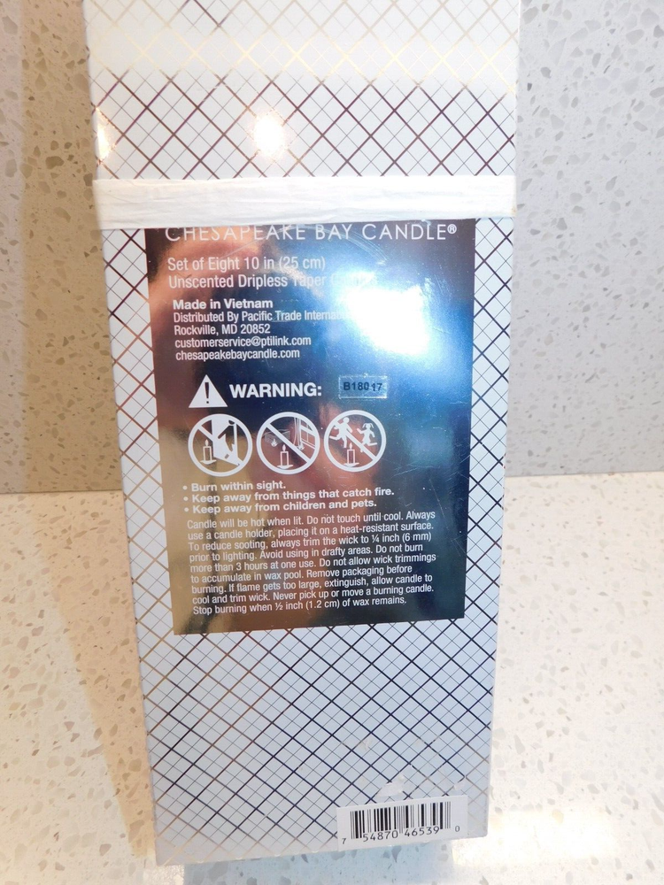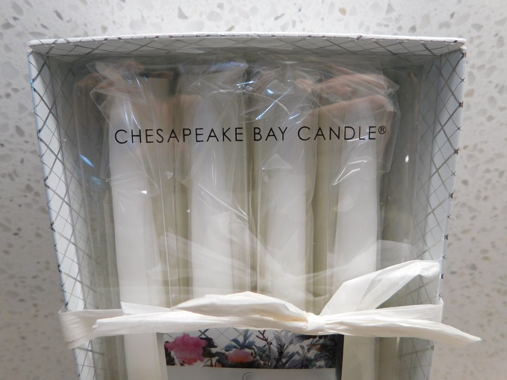 New in Box Chesapeake Bay Candle "Garden Party". Set of 8 Unscented Dripless Candles. 10" Taper. White.