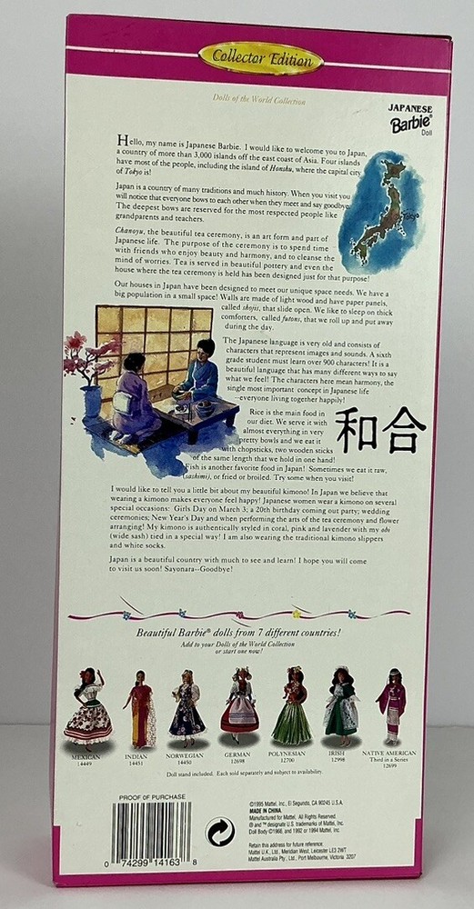 This 1995 Dolls of the World Japanese Barbie #14163 is a vintage collectible that is sure to delight any Barbie enthusiast. This fashion doll features a beautiful Japanese ethnicity and comes from the Dolls of the World Collection. It was manufactured by Mattel in 1995 and is an original, licensed reproduction. The doll is new in box and has never been played with. It includes the doll itself, and is perfect for collectors who appreciate the artistry and craftsmanship of vintage Barbie dolls. This product line is popular among collectors and is a great addition to any collection.
