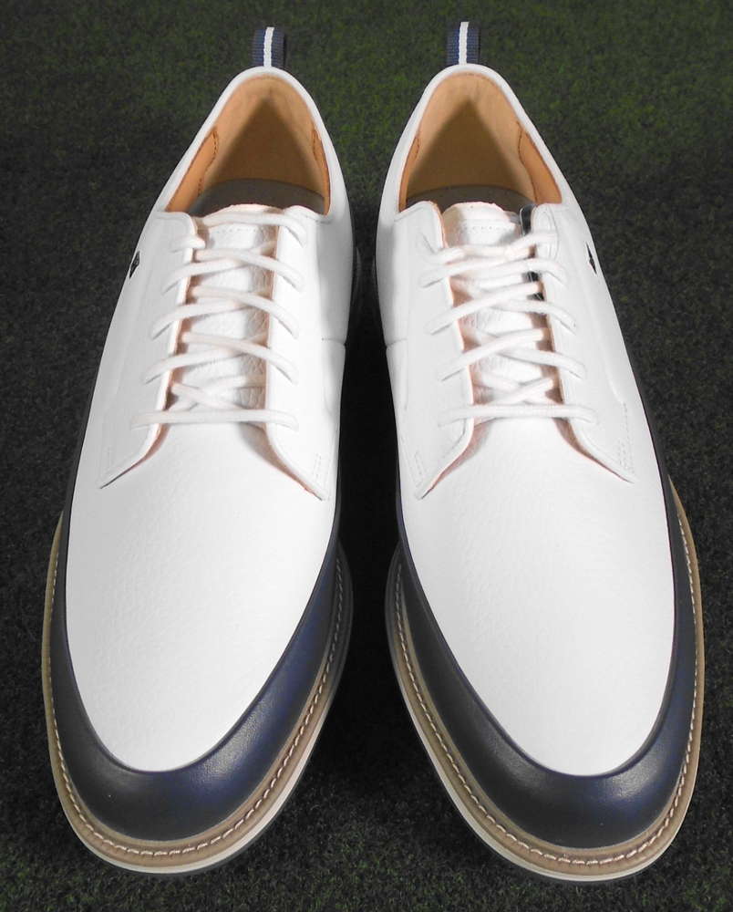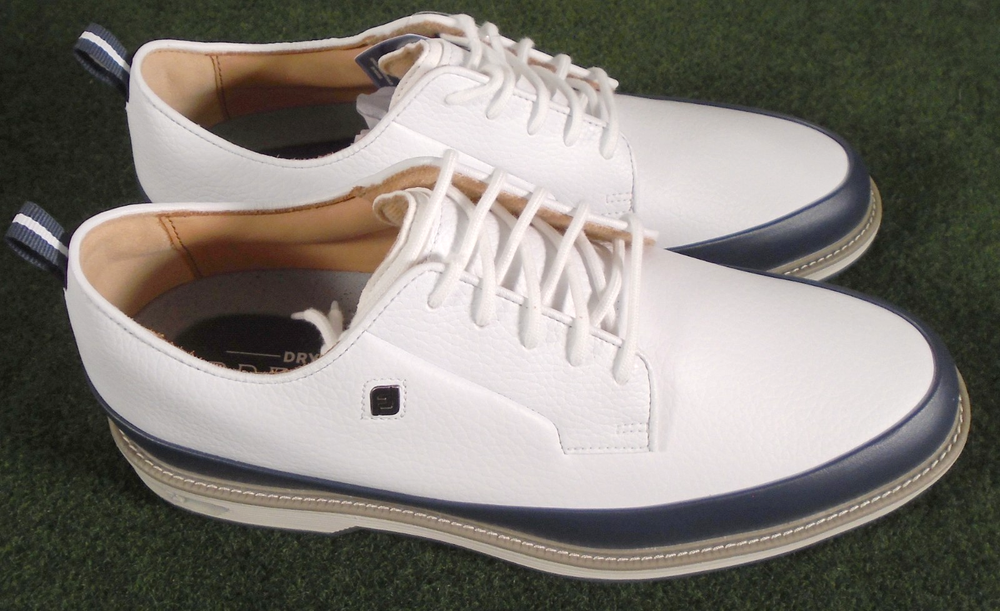 New in box Footjoy Premiere Field LX men's golf shoes, white / navy, item #54395. Premium Waterproof Leather Full Leather Linings Pulsar Low Profile Cleats by Softspikes FastTwist 3.0
