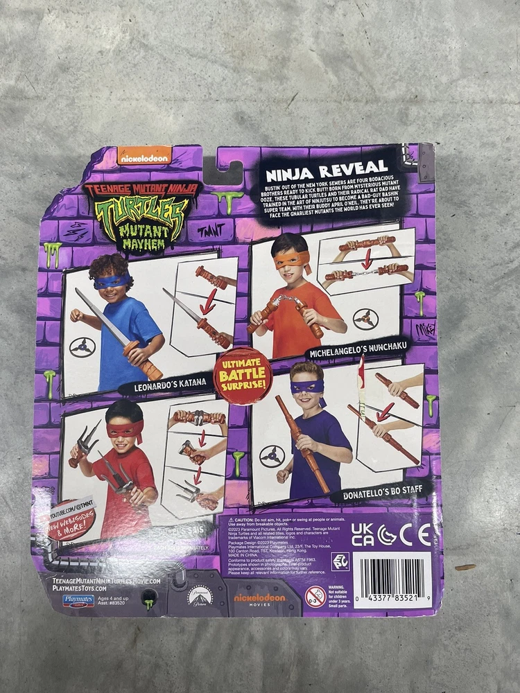Get ready for some ninja action with this brand new Leonardo's Katana from the Teenage Mutant Ninja Turtles series. Made by Playmates Nickelodeon as part of their Mutant Mayhem line, this toy is perfect for kids aged 4 and up. It comes with a ninja reveal feature and is sure to provide hours of entertainment. The katana is made in China and is an excellent addition to any young TMNT fan's collection. This toy is in its original packaging and has never been opened. Dress up and get ready to fight crime alongside Leonardo and his turtle brothers with this amazing toy.