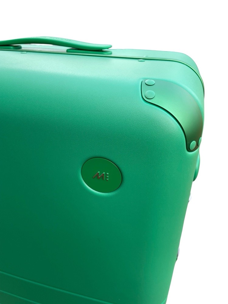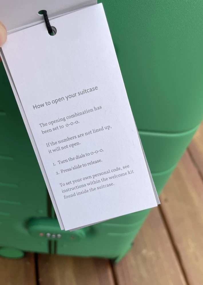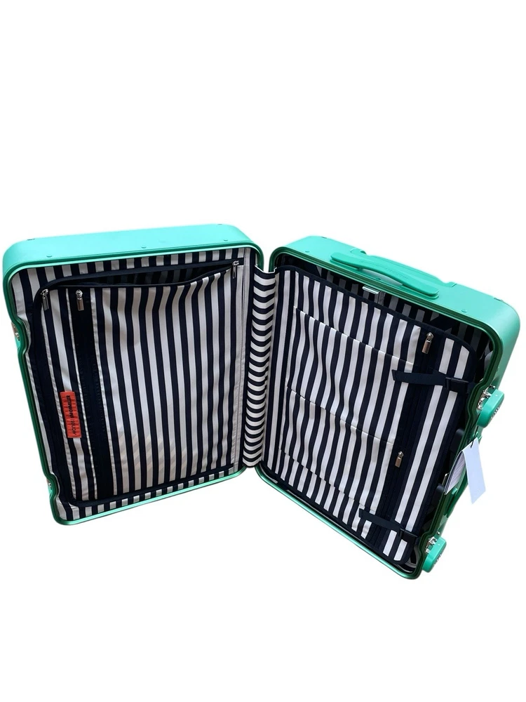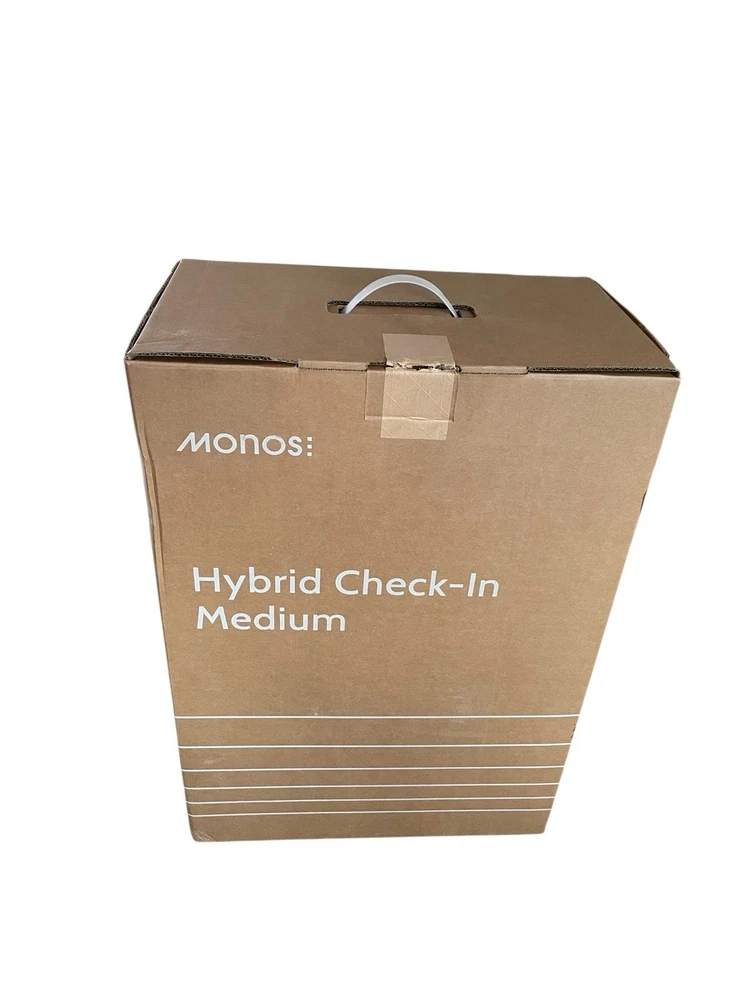 New in box Dimensions on box Water-resistant polycarbonate hard shell with recycled materials - 360 spinner wheels - Zipperless aluminum frame with corner guards - Adjustable telescopic handle - Color-matched components - Soft anti-microbial lining made from recycled polyester - Vegan leather trim - Two TSA-approved combination locks