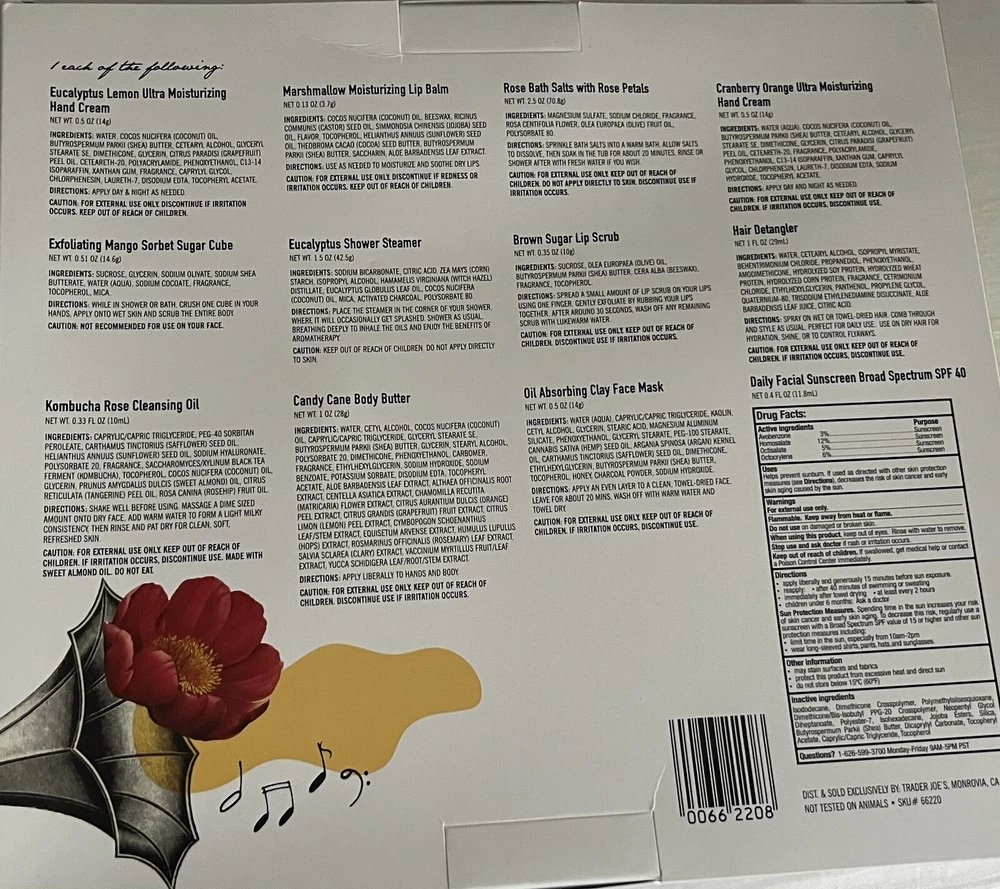 You are looking at ONE **** TRADER JOE’S 2022 12 DAYS OF BEAUTY ADVENT CALENDAR set. This 12 piece set comes with an assorted array of products from shower, steamers to lip scrubs to facemasks a hair detangler, a body butter, a cleansing oil, handcream, and a sunscreen. *****PLEASE read the ENTIRE description before you buy!***** YOU ARE GETTING **ONE** gift set as shown with your purchase. Item is NEW AND UNTESTED. Items are from a smoke and pet-free environment. ****THE ITEM SHOWN IN THE PICTURE IS WHAT YOU'LL GET**** PLEASE ASK QUESTIONS BEFORE BIDDING, ITEM IS SOLD AS SHOWN AND DESCRIBED. NO RETURNS/REFUNDS, UNLESS WE HAVE MADE A GROSS ERROR IN THE ITEM DESCRIPTION. By bidding, buyer agrees to make payment within 48 hours of the purchase. Shipping will be $6.95 added to the purchase price. Thanks for looking-check back again soon for more deals! WE ALSO REDUCE THE SHIPPING TO OUR MULTIPLE-AUCTION WINNERS when all items are paid for in one transaction only.