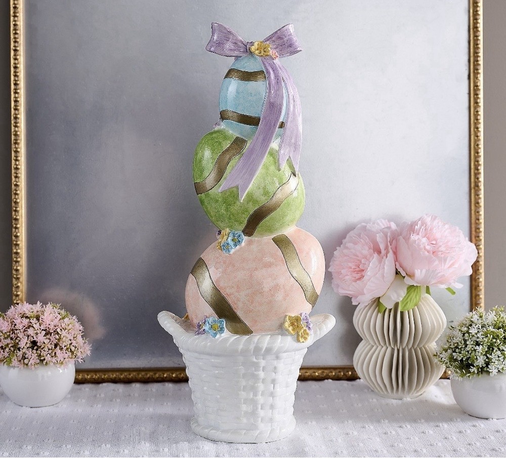 Crafted in pretty pastels with goldtone accents, this delightful egg tree provides a pop of color and plenty of playful appeal for your spring decor. Pink, green, and blue eggs are stacked in a basket and topped with a lavender bow. Flower accents complete this seasonal focal point that makes a sweet gift for the Easter host (but that's only if you can bear to part with it!). From the Valerie Parr Hill Collection. • Pastel colored eggs stacked in a basket; golden accents; flower details; and lavender bow on top • Resin construction finished in high gloss • For indoor decorative use only • Measures 18-1/2"H × 8-1/2"L × 6-1/2"W Free Shipping