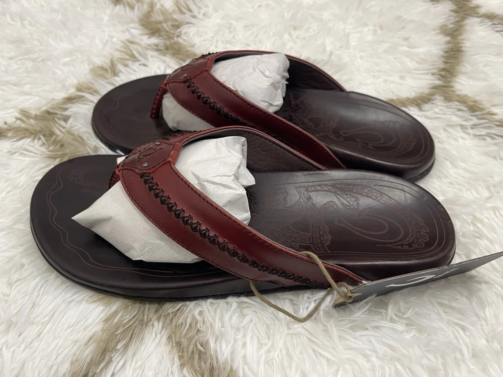 Closure: Slip On Type: Sandal Country of Origin: United States Lining Material: Leather Outsole Material: Leather Theme: Outdoor, Beach Customized: No Brand: OluKai Insole Material: Leather Color: Terra / Dark Wood Pattern: Solid Vintage: No Model: OluKai Mea Ola Style: Flip Flop Upper Material: Leather Features: Arch Support, Comfort Department: Men US Shoe Size: 10 Season: Spring, Summer Accents: Embroidered, Logo Occasion: Casual Handmade: No Character: Flop Shoe Width: M Product Line: Mea Ola
