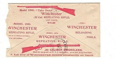 This is a nice advertising envelope, printed in red, with illustrations on the front & back. Front says: The WINCHESTER Repeating "TAKE DOWN" SHOTGUN. For sale by The Haynes & Chalmers Co., Bangor ME. The front illustration shows the two parts of the take down shotgun. It is postmarked Bangor, ME Oct. 17, '99. The back has two illustrations: 1) Model 1890, "Take Down Winchester .22 Cal. REPEATING RIFLE. List Price, $16.00 2) Model 1894 WINCHESTER Repeating Rifle. .30 Caliber Smokeless. Made for .25-.35 and .30 W.C.F. Smokeless; .32-.40 and .38-.55 Cartridges. Also on back: Model 1886 WINCHESTER Repeating Rifle, Made for 16 different Cartidges; .38 to .50 caliber (no illustration of this one) and -USE- WINCHESTER RELOADING TOOLS. At the bottom it says: A full line of Winchester Goods constantly on hand. FAIR-GOOD condition. Slight edge and corner wear. Very slight soiling, opened rather rough at right with some reduction. Nothing affected on front but slight affect on text on left side of cover on back. I use a poor/fair/good/very good/excellent/mint grading system and grade very conservatively (see my feedback). This does NOT necessarily correspond to the generic Ebay grading system that we must use. Shipping is $2.95 in the U.S. International Buyers – Please Note Please obtain shipping quote before bidding. Import duties, taxes and charges are not included in the item price or shipping charges. These charges are the buyer's responsibility. Please check with your country's customs office to determine what these additional costs will be prior to bidding/buying. Thank you. We cannot be responsible for transit times through customs. THANKS FOR LOOKING! WE NOW HAVE OUR EBAY STORE! CHECK IT OUT FOR MORE VINTAGE ITEMS. Track Page Views With Auctiva's FREE Counter