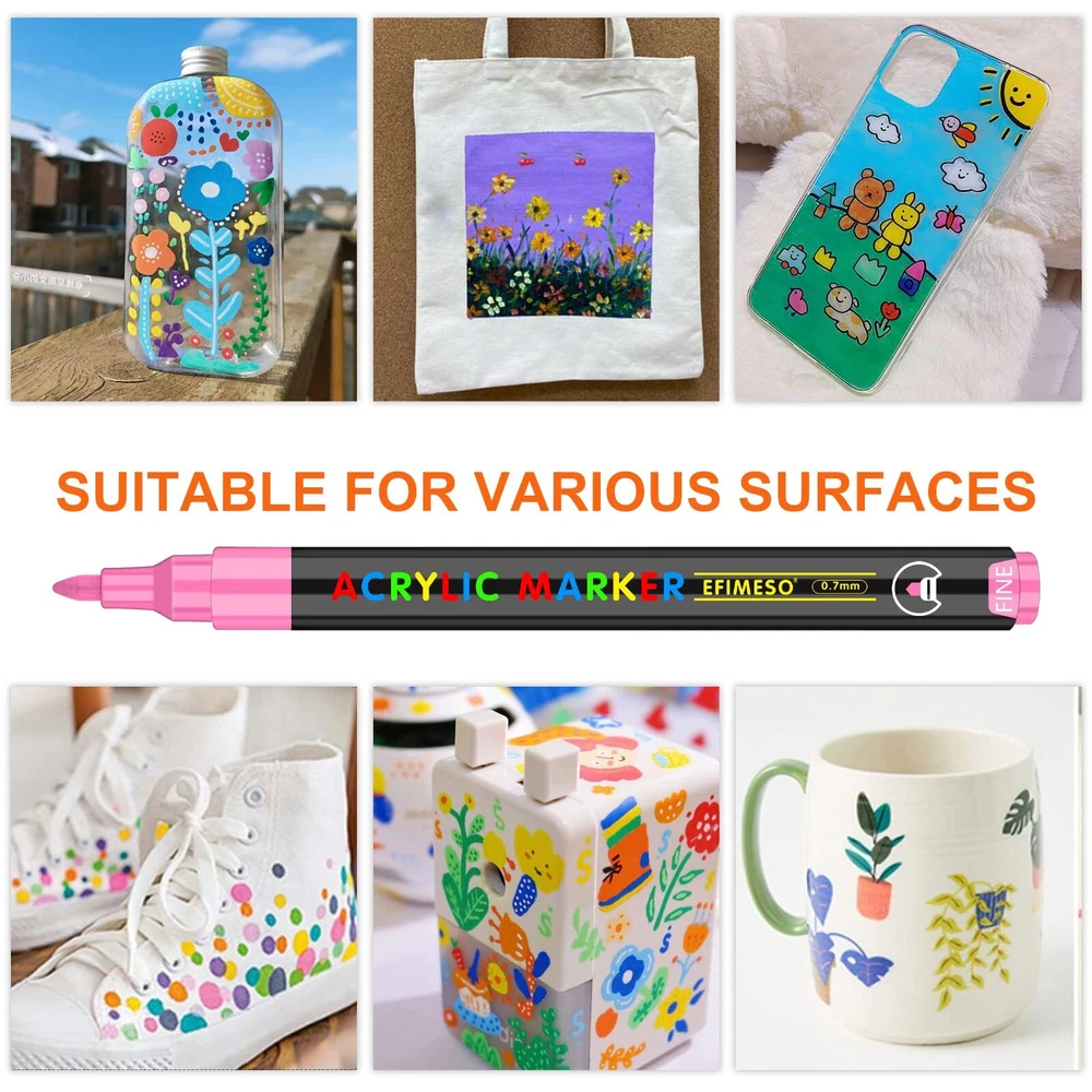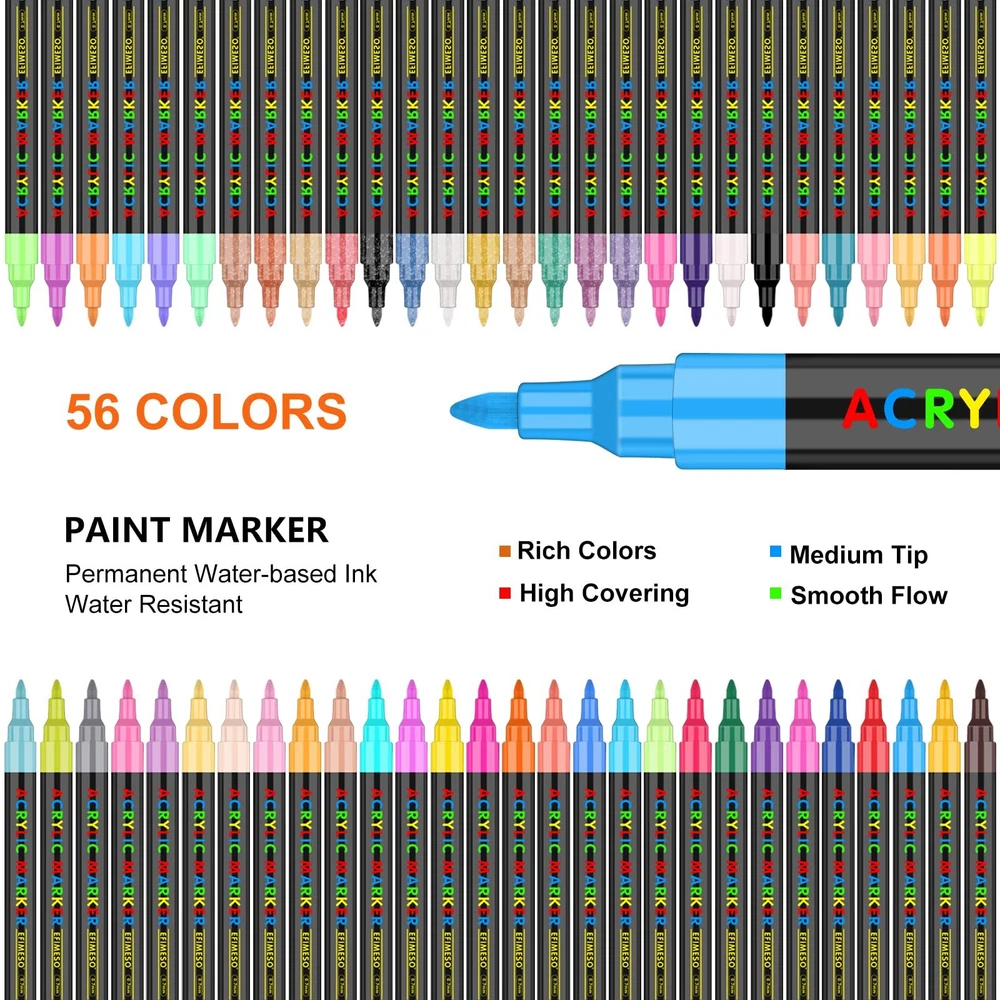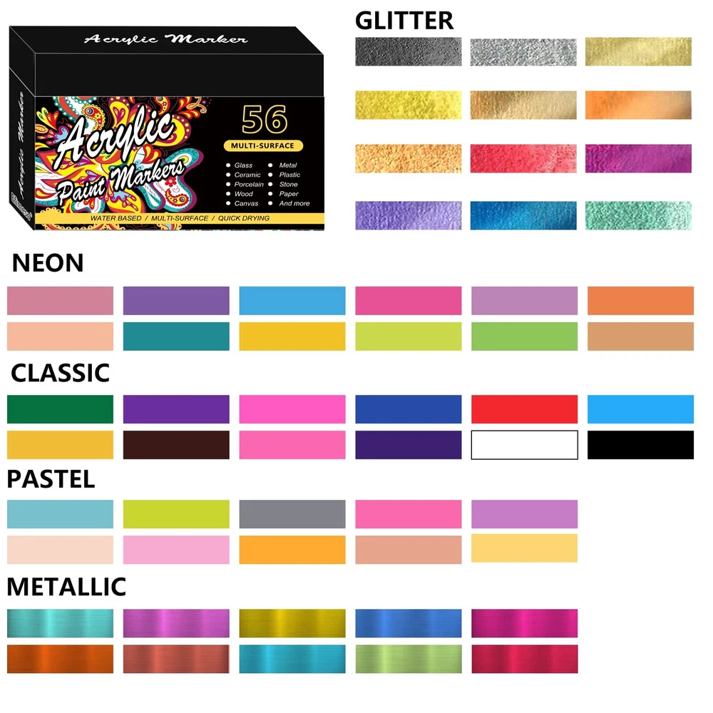 56 VIBRANT COLORS:Our marker pens are premium water-based ink,Quick-drying, Long-lasting, Not to Fade. Acrylic paint pens set come with 56 vibrant colors that Contain 5 unique type. Including GLITTER、METALLIC、NEON、PASTEL、CLASSIC. EXTRA FINE TIP: The acrylic paint pens equipped 0.7mm extre fine tip that suitable for outline Details、Blending、Coloring and Shading. SAFE & NON-TOXIC: Acrylic paint markers non-toxic and acid-resistant.Conforms to ASTM D-4236 and EN71 certificate. Suitable for kids, adults, students, artists, and professional. MULTI-SURFACE: Premiun acrylic paint markers use water-based ink. Apply to any surface, such as Canvas, Rock painting, Ceramic, Canvas , Wood, Easter eggs,Fabric, Stone, Metal, Plastic, Glass and more. Customer Satisfaction is Our Priority: We’re committed to providing excellent after-sales support. If you have any concerns or issues, please send us an email, and we’ll respond within 24 hours.