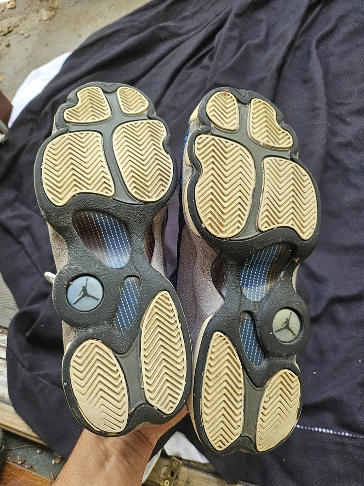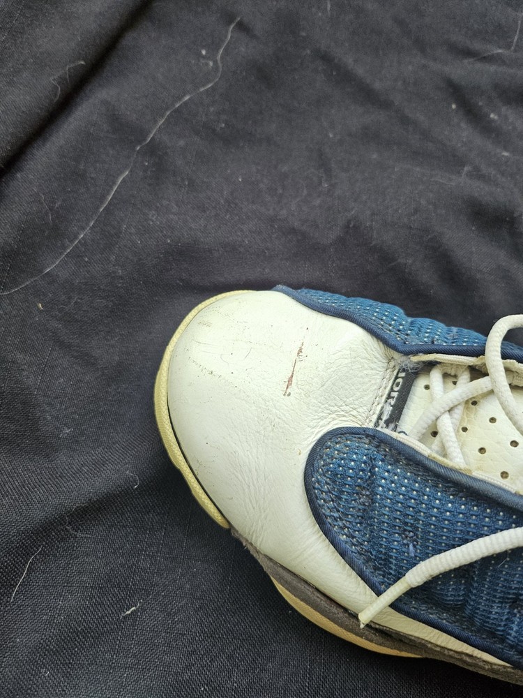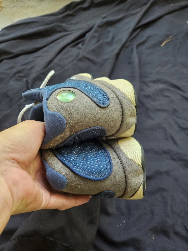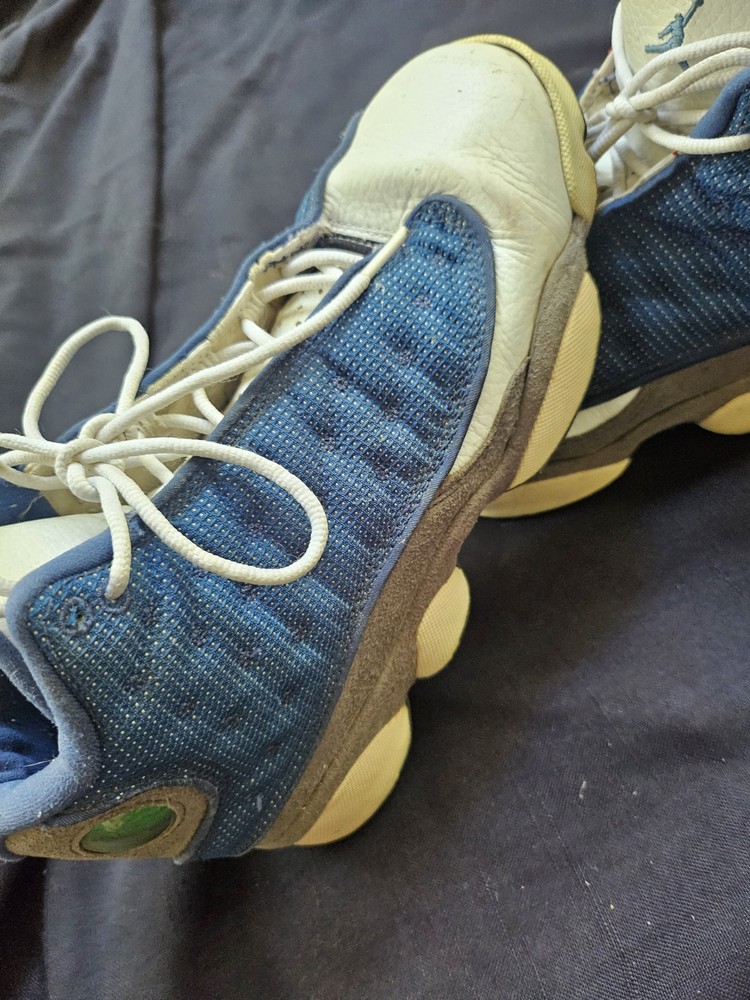 Blemishes pictured The NIKE AIR JORDAN XIII 13 RETRO GS FLINT GREY 414574 401 in size 7Y is a stylish and comfortable sneaker designed for boys. This athletic shoe features a closed toe, lace-up closure, and a high-top shoe shaft style. Made with a blended fabric upper and a rubber outsole, it offers moderate cushioning and adjustable fit, perfect for activewear and casual occasions during the summer, fall, and spring seasons. The gray color and Jordan logo accents add a touch of retro style to this Jordan 13 model, making it a must-have for young sneaker enthusiasts.