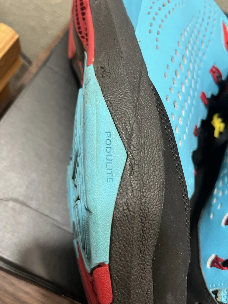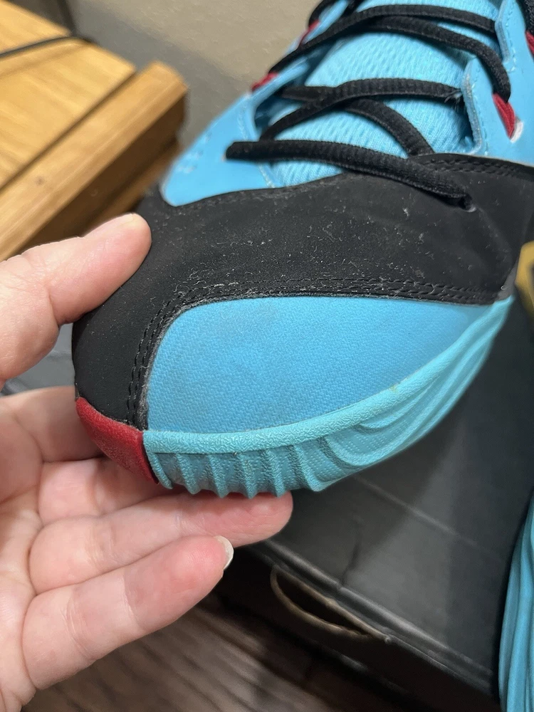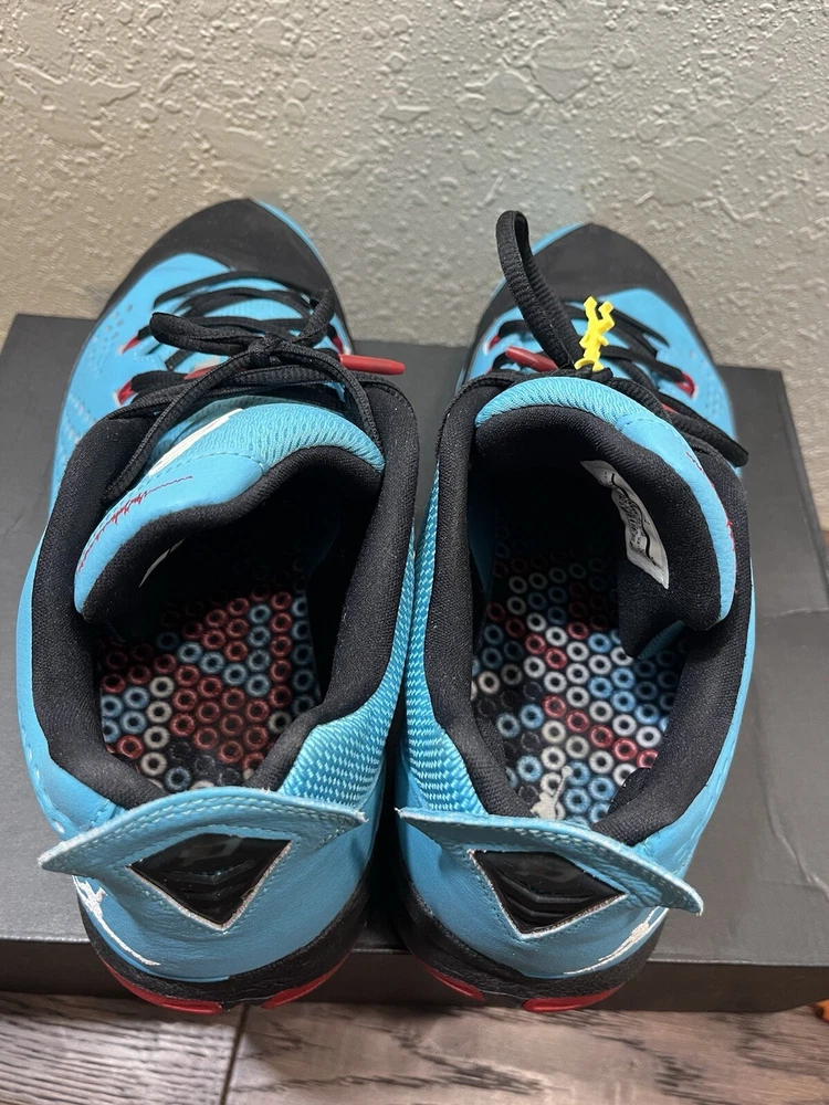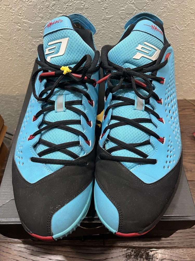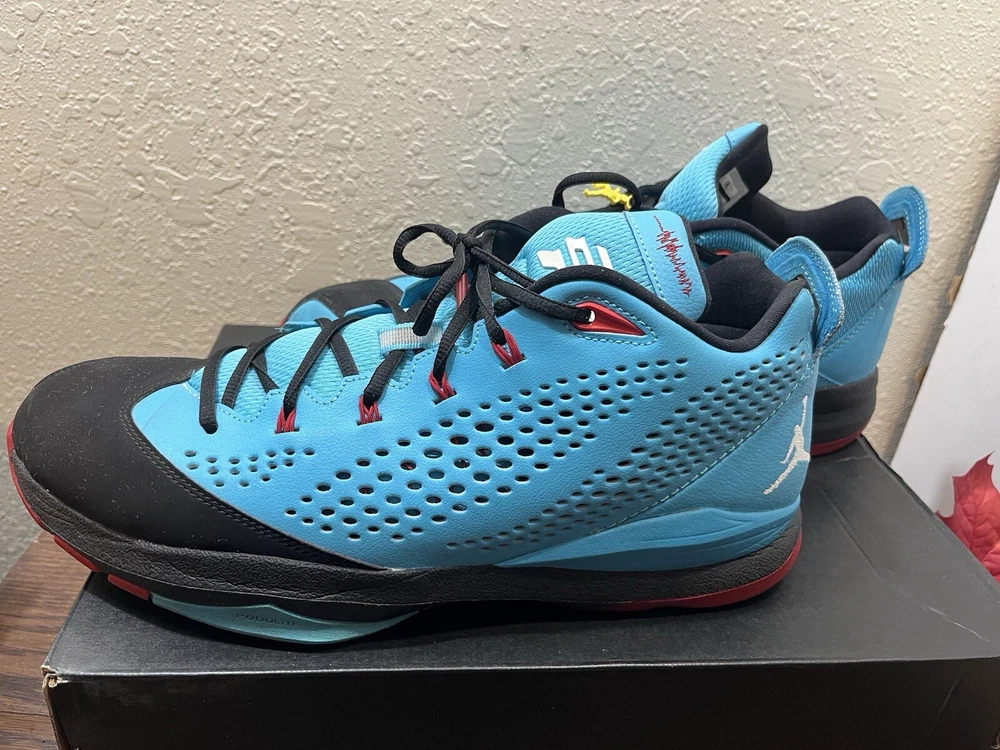 Step up your sneaker game with these Nike Air Jordan CP3 VII Chris Paul 616805-402 Gamma Blue Phoenix Suns shoes. Designed with a low top shoe shaft style, these basketball shoes are perfect for cross training, CrossFit, casual wear, and basketball activities. Made with a nylon upper material, these shoes are durable and comfortable to wear. The shoes come in a stylish Gamma Blue color with a geometric pattern and a character of Teal Blue. They have a standard shoe width and are available in US Shoe Size 13, UK Shoe Size 12, and EU Shoe Size 47.5. The shoes were manufactured in China in 2013 and have a style code of 616805-402. These athletic shoes are a perfect addition to any sneaker collection and are sure to make a statement. Preowned shoes in good solid bright condition. The tread is really good as well. The shoes on the left hand toe have a light 1 inch scuff right below the shoelaces. There is some light discoloration from wire around the front right toe on the inside and of course there is light discoloration around the rings and soles of the shoes from light use.these shoes were produced in 2013 and are an overall really good shape. Price below market to adjust for minor flaws. Does not come with original box.