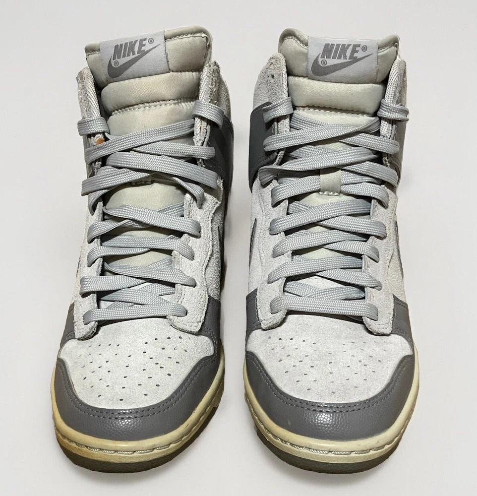 Shoes In Good Condition with some Stain as seen in the pictures… Elevate your sneaker game with these Nike Dunk Sky High Hidden Wedge Heel Cannon Gray Shoes. The lace-up closure ensures a secure fit while the rubber outsole provides excellent traction. These shoes feature a hidden wedge and hidden heel for added comfort and style. The gray color and solid pattern make these shoes versatile for any occasion, whether it's casual or athletic. The Nike logo accents and sky-high design add a touch of personality. These shoes are available in women's US size 7.5 and UK size 5, with an EU size of 38.5. Perfect for any season, these Nike Dunk Sky High shoes are a must-have for any sneakerhead.