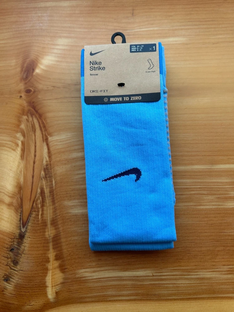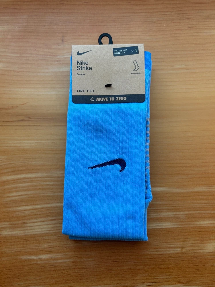 Elevate your game with the Nike Strike Knee-High Socks, specifically designed for the dynamic athlete. These socks feature a cushioned design to absorb impact, ensuring comfort with every step, stride, or shot. The Dri-Fit technology helps keep your feet dry and cool, making them a reliable choice for soccer, football, or any intense gym workout. Crafted for unisex kids and available in a striking blue color, these socks are a versatile addition to any sportswear collection. The combination of cotton, nylon, polyester, and spandex materials provides a snug fit that stays in place, while the solid pattern and knee-high style offer a classic look that's ready for any season. Thank you!