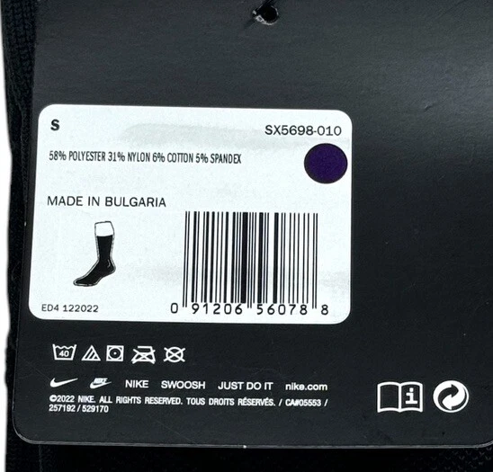 NIKE VAPOR Football Crew Socks SX5698 Black White Sz S Unisex YTH 3Y-5Y WMN 4-6 NEW In Pack!!! Please See All Pictures. NIKE VAPOR 1-Pair Football Dri-Fit Crew Socks SIZE Available: SMALL YTH MEN’S US Shoe Fit Size Available: 3Y-5Y WOMEN’S US Shoe Fit Size Available : 4-6 PATTERN: Striped COLOR : Black/White RETAIL PRICE: $18.00 + Tax Description: 31% Nylon, 58% Polyester 5% Spandex 6% Cotton Machine Wash Cold Imported