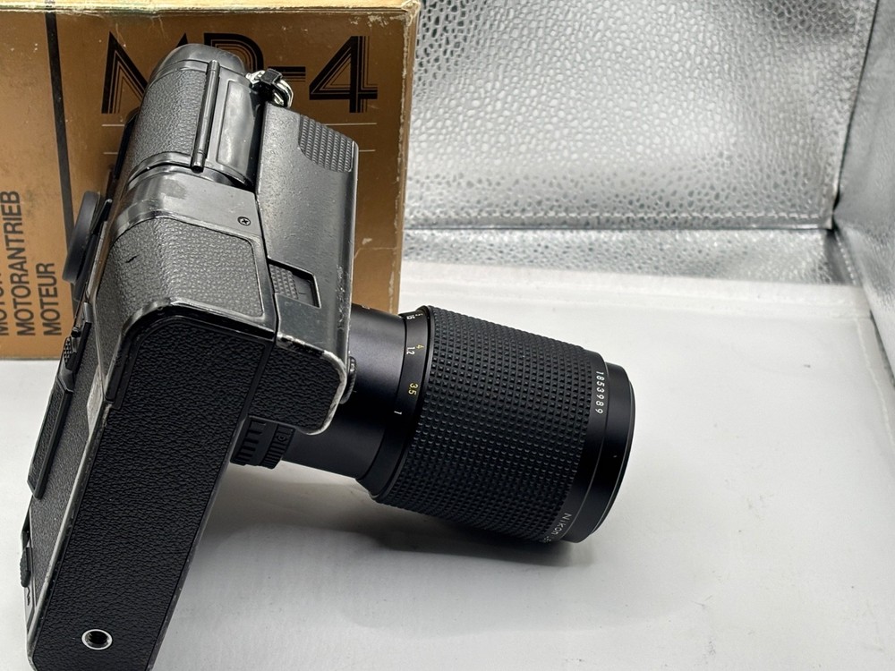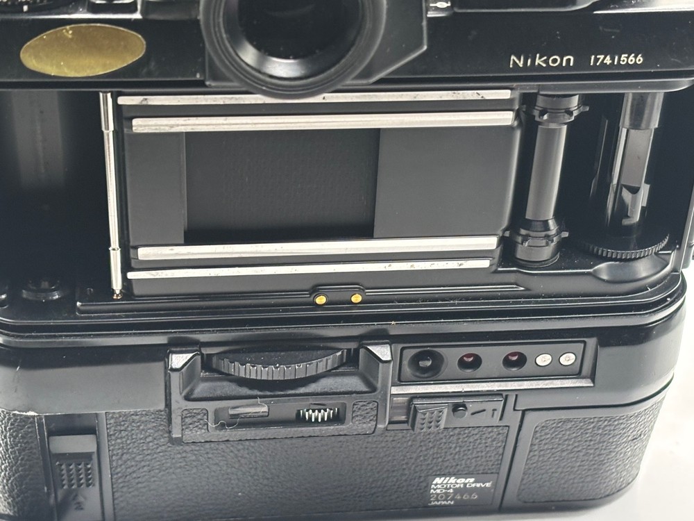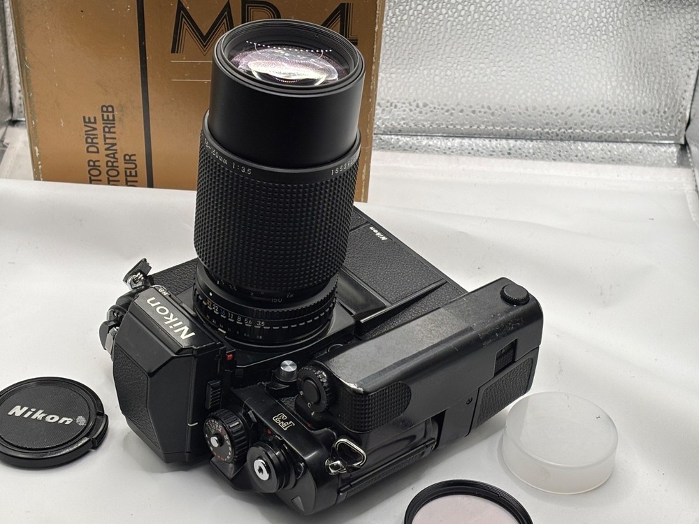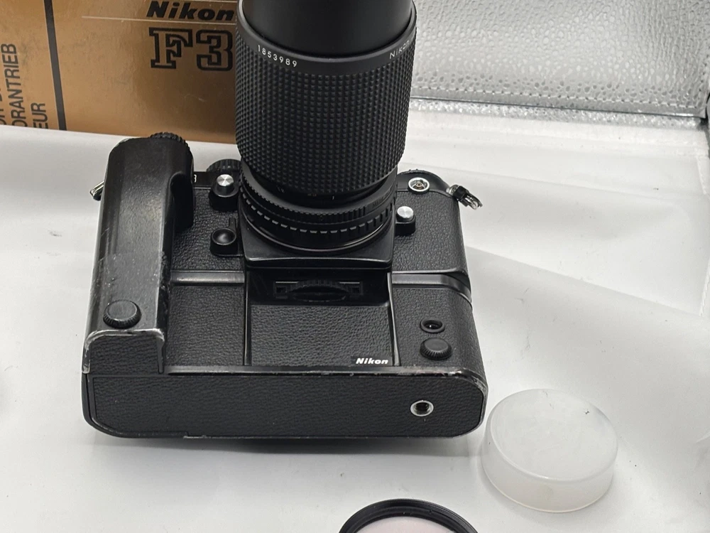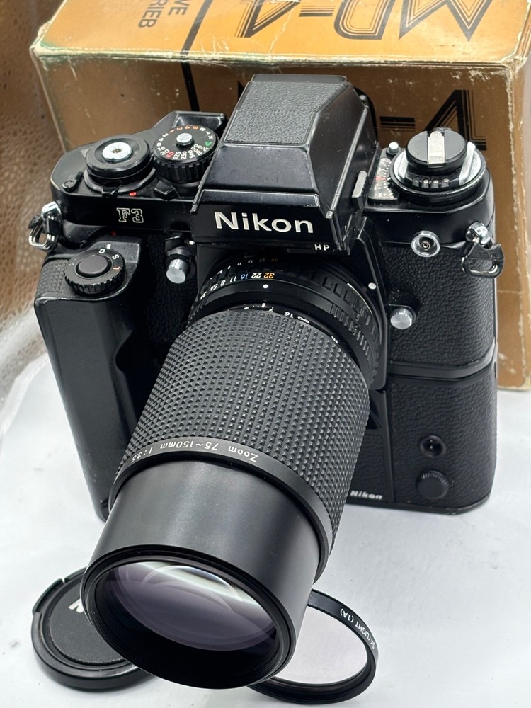 Photos of the actual camera up for consideration : Ships within 48 business hours, usually within 24 hours NIKON F3HP 35mm Film SLR Camera with Nikon MD-4 Motor drive and Nikon 75-150mm E Zoom Black, With High Eyepoint HP Prism finder. Everything functions well. Condition is Mint- with minimal signs of use, same with the lens The MD 4 motor drive is more on the order of Excellent + with some edge wear but good clean battery compartments Body, the HP Finder is working well w they body shows minimal use, with film rails and internals clean external has no dings or dents. See photos, and ask any questions you may have. The 75-150mm Nikon Zoom-Nikkor lens gives 75-150mm range good for portraits, telephoto, action. no fungus, nice condition, no scratches on lens surfaces, caps, lens zoom has some creep if not held The MD-4 Motor drive works - see the video - and has clean battery chambers - box is included, but no manuals or batteries