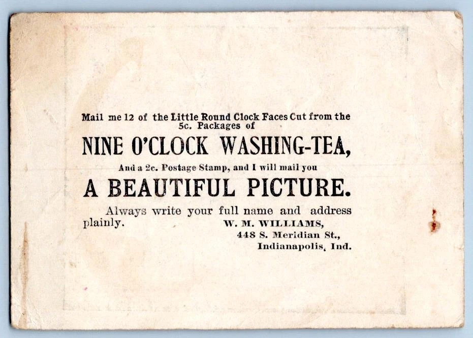 Vintage 1870's - 1890's era Victorian trade card, as shown. Please view scans carefully for condition. It measures approx. 3" x 4 1/2". NINE O'CLOCK WASHING TEA WM WILLIAMS INDIANAPOLIS COUPON VICTORIAN TRADE CARD NINE O'CLOCK WASHING TEA WM WILLIAMS INDIANAPOLIS COUPON VICTORIAN TRADE CARD Click images to enlarge Description APPLEBY'S ATTIC TREASURES Specializing in Original Vintage Ephemera - Advertising - Postcards - Victorian Trade Cards - And More! Vintage 1870's - 1890's era Victorian trade card, as shown. Please view scans carefully for condition. It measures approx. 3" x 4 1/2". A short history of trade cards (from Collectors Weekly): Victorian trade cards are an early form of collectible advertising. Popularized after the Civil War by businesses, they offer a colorful and diverse look at popular culture and society in the late 1800s. Trade cards originated in England in the 1700s with tradesmen advertising their wares. But the advent of lithography in the 1870s made it possible to mass-produce them in color, leading to a golden age from 1876 to the early 1900s when halftone printed newspaper and magazine ads became more economical. Trade cards typically had a picture on one side and an ad on the other. There were custom cards printed for specific products, and stock cards which could be used for any product. Trade cards were popular for medicines, sewing, and farm equipment, and a range of other products. Some rare Victorian trade cards are now worth thousands of dollars, for example cards advertising Clipper Ships traveling from the East Coast to California in the 1860s. Payment Payment is expected within 5 days of end of auction - please contact us if you need to make other arrangements. Shipping All items will be shipped within 1 business day after payment is received. Images sell! Get Supersized Images & Free Image Hosting Create your brand with Auctiva's Customizable Templates. Attention Sellers - Get Templates Image Hosting, Scheduling at Auctiva.com. Track Page Views With Auctiva's Counter