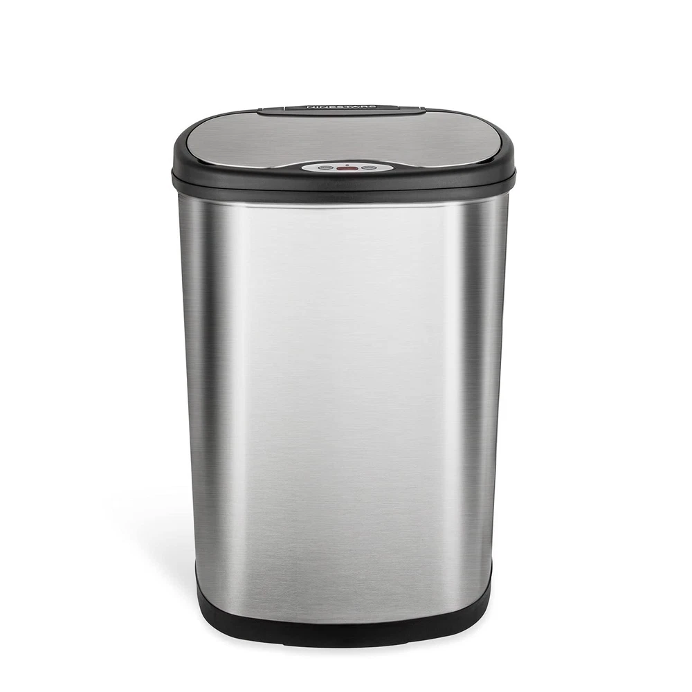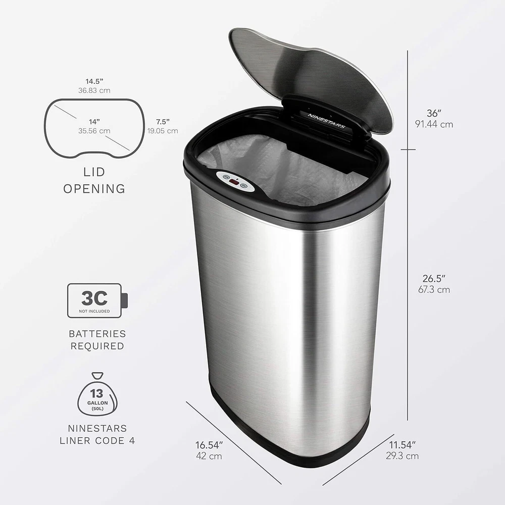 About this item 【Hassle Free Two-Year Warranty】Hassle free warranty process with our dedicated customer service line and at no additional charges for your defective parts 【High Quality Materials】Water-resistant infrared motion sensor prevents moisture or any accidental spills from damaging the unit. Plust finger-print resistant stainless steel base helps keep the can clean. 【Advanced Technology】 Delay sensing technology preserves battery life and prevents any unnecessary opening from pets, children, or walking by. Quiet closing function for longivity of product life. 【Touch-free Motion Sensor Lid Clouser】Seal odor in and eliminate cross-contamination of germs. Requires 3 C batteries (not included), Alkaline battery highly recommended for best performance. 【Ease and Convenient】Removable ring liner holds trash bag sturdy in place and prevents bag from overhanging for a neat and clean appearance. Use any standard trash bags or NINESTARS custom trash bags NSTB-13-30.