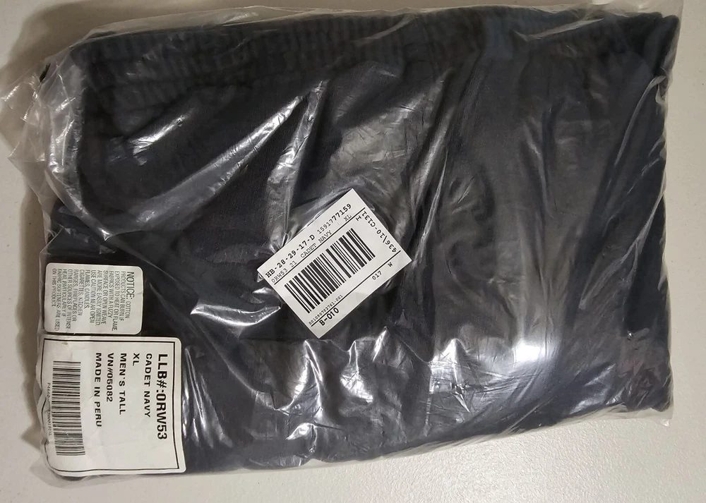 Men's LL Bean XL Tall Cadet Navy sweatpants with side pockets and elastic, and drawstring waist. The legs have elastic at the ankles. 82% Cotton 18% polyester New in package. I removed it from the package to measure and take pictures. Measurements: Waist : 36" Inseam: 32" Measured lying flat. Waist is elastic with drawstring, so it can accommodate a little range in sizing. Returns accepted within 30 days in same condition as purchased. Buyer pays return shipping. Shipping: I'm packing this tightly in a Priority Mail to save on ship