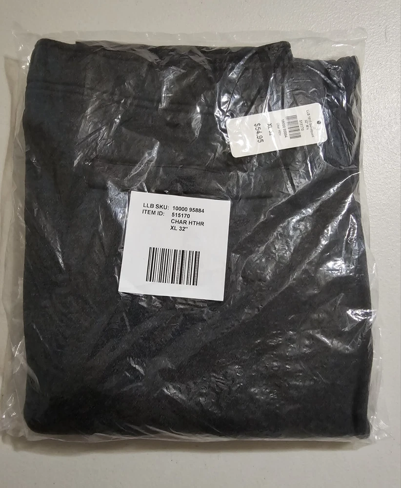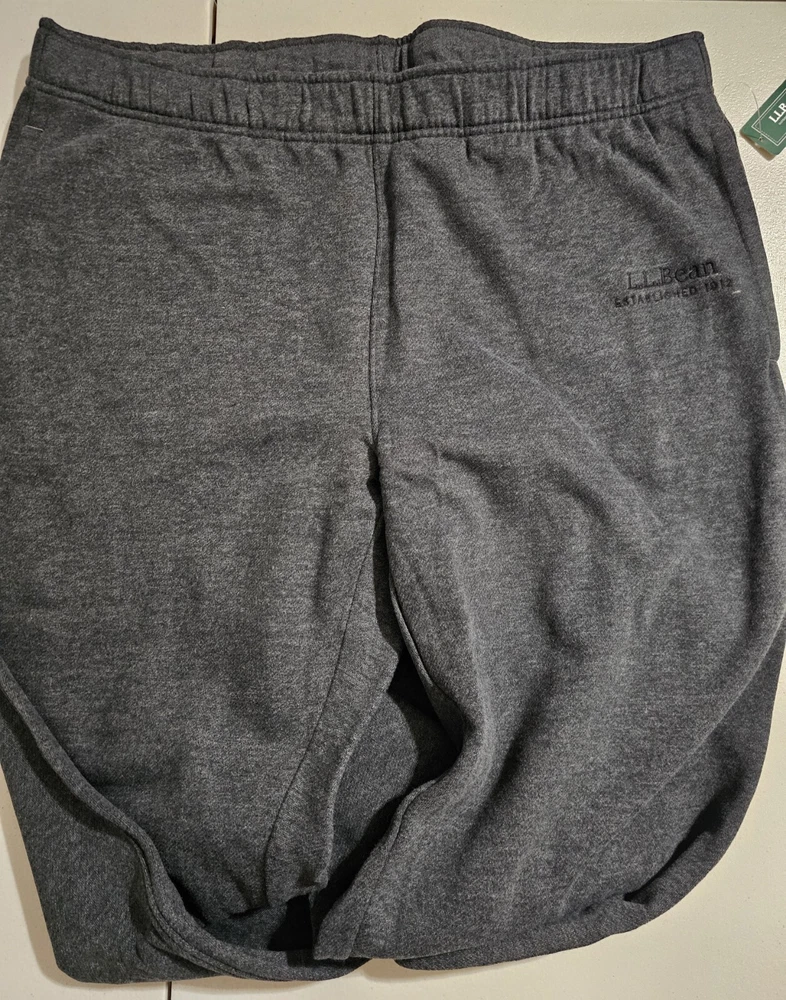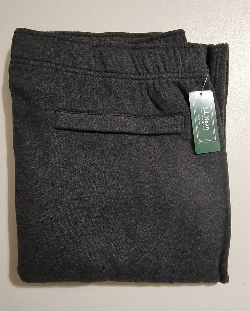 If you especially want something comfortable to wear, these are it. They are so soft! Men's LL Bean XL Charcoal Heather sweatpants with side pockets and elastic with drawstring waist. The legs are just straight at the bottom, with no zipper or elastic. 60% Cotton 40% polyester New in package. I removed it from the package to measure and take pictures. Measurements: Waist : 36" Inseam: 32" Measured lying flat. Waist is elastic with drawstring, so it can accommodate a little range in sizing. Returns accepted within 30 days in same condition as purchased. Buyer pays return shipping. Shipping: I'm packing this tightly in a Priority Mail to save on shipping.