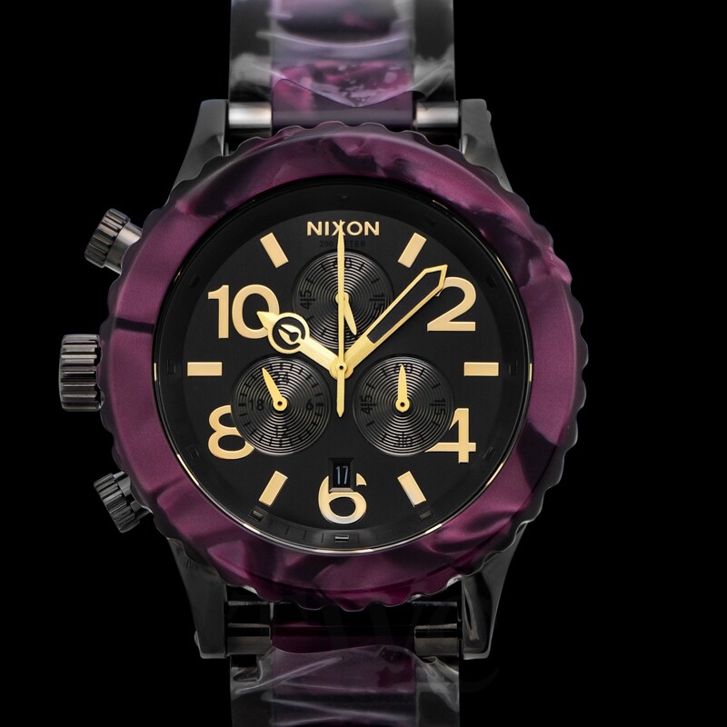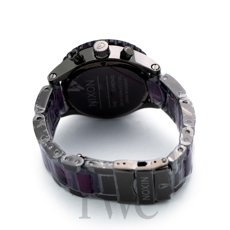 Full Set Nixon NEW Quartz Black Dial Gunmetal-tone Stainless Steel Unisex Watch. Condition: NEW Brand: Nixon Ref. No.: A037-1345 Model: 48-20 Chrono Dial Color: black Movement: Quartz Case Material: Gunmetal-tone Stainless Steel Bracelet Material: Gunmetal-tone Stainless Steel with Purple Acetate Gender: Unisex